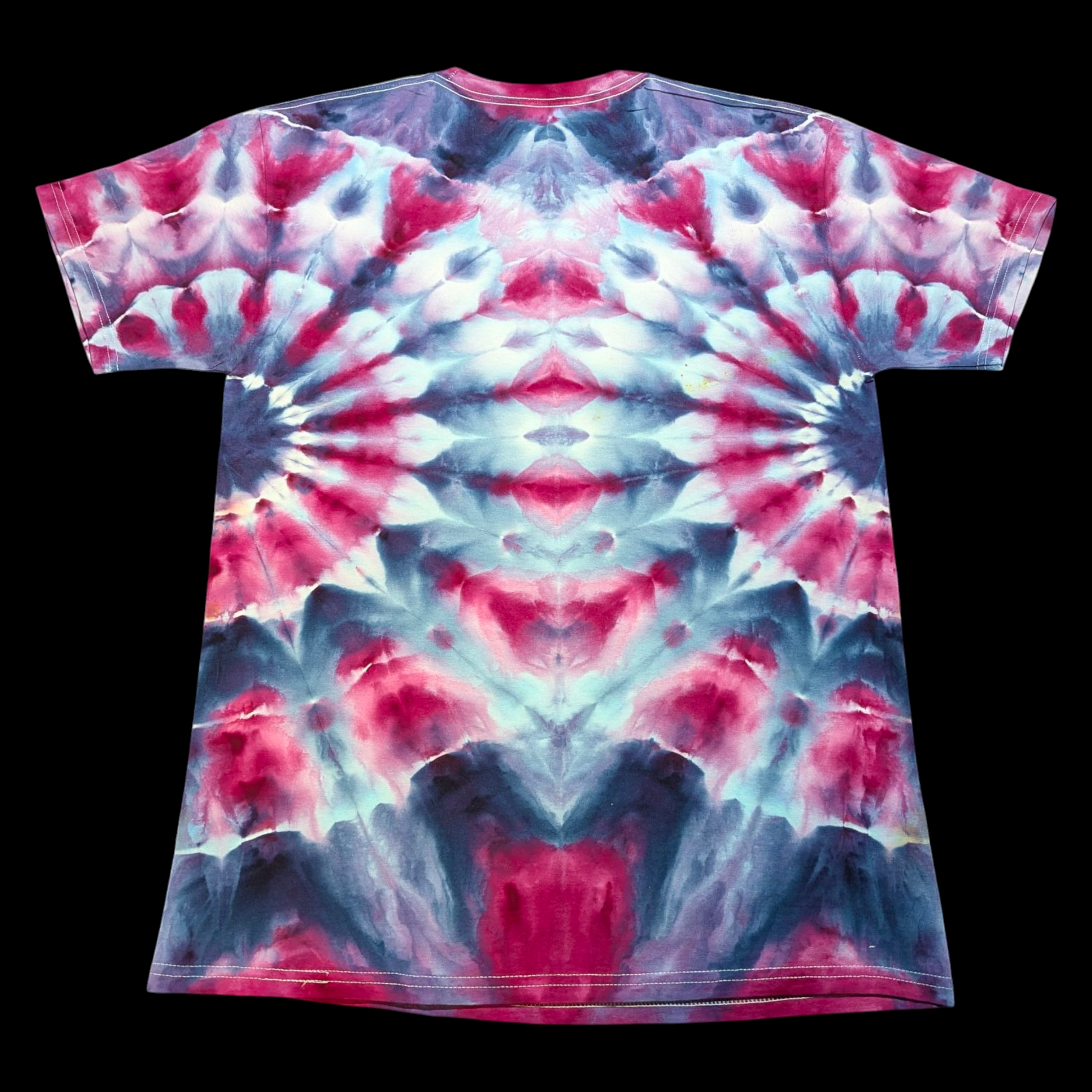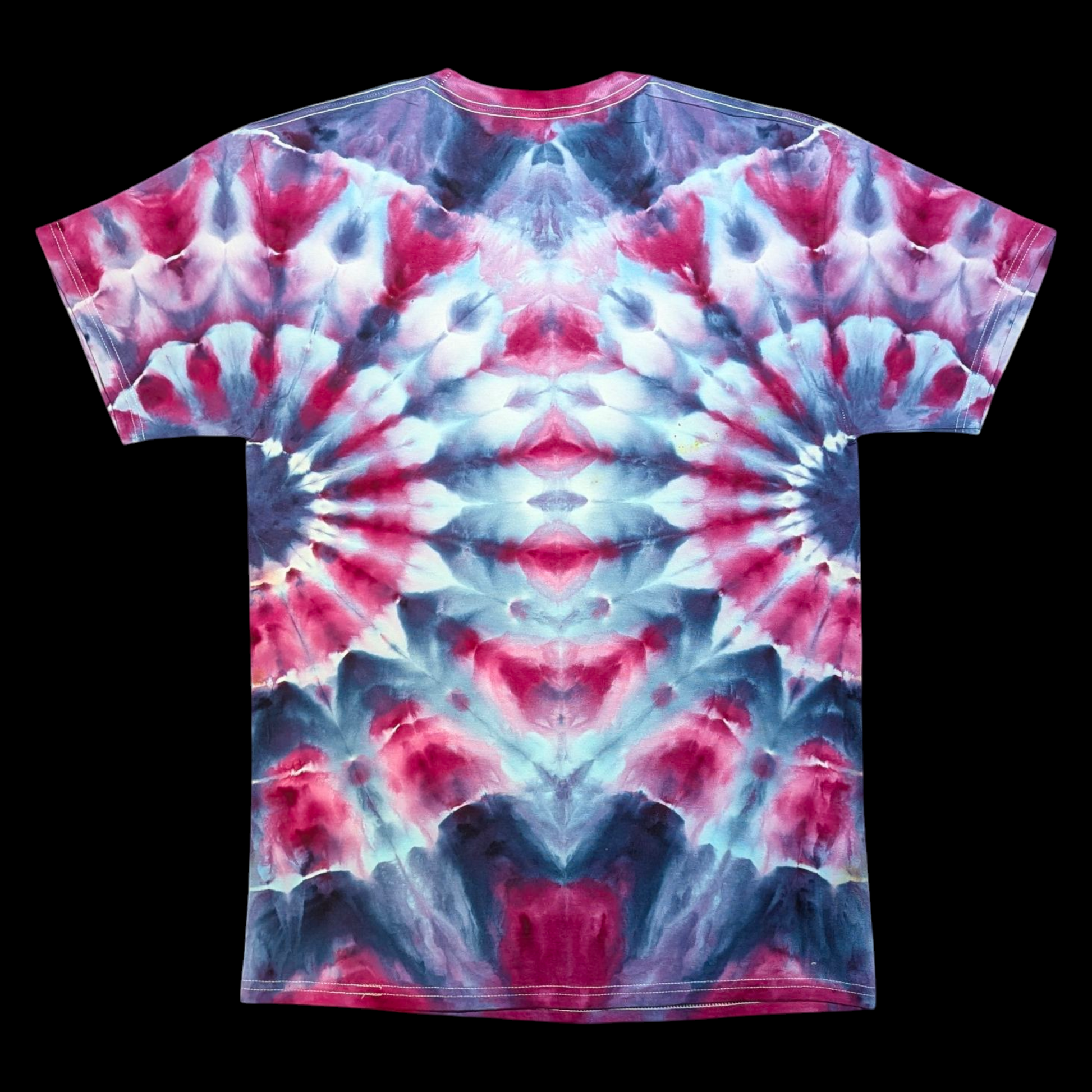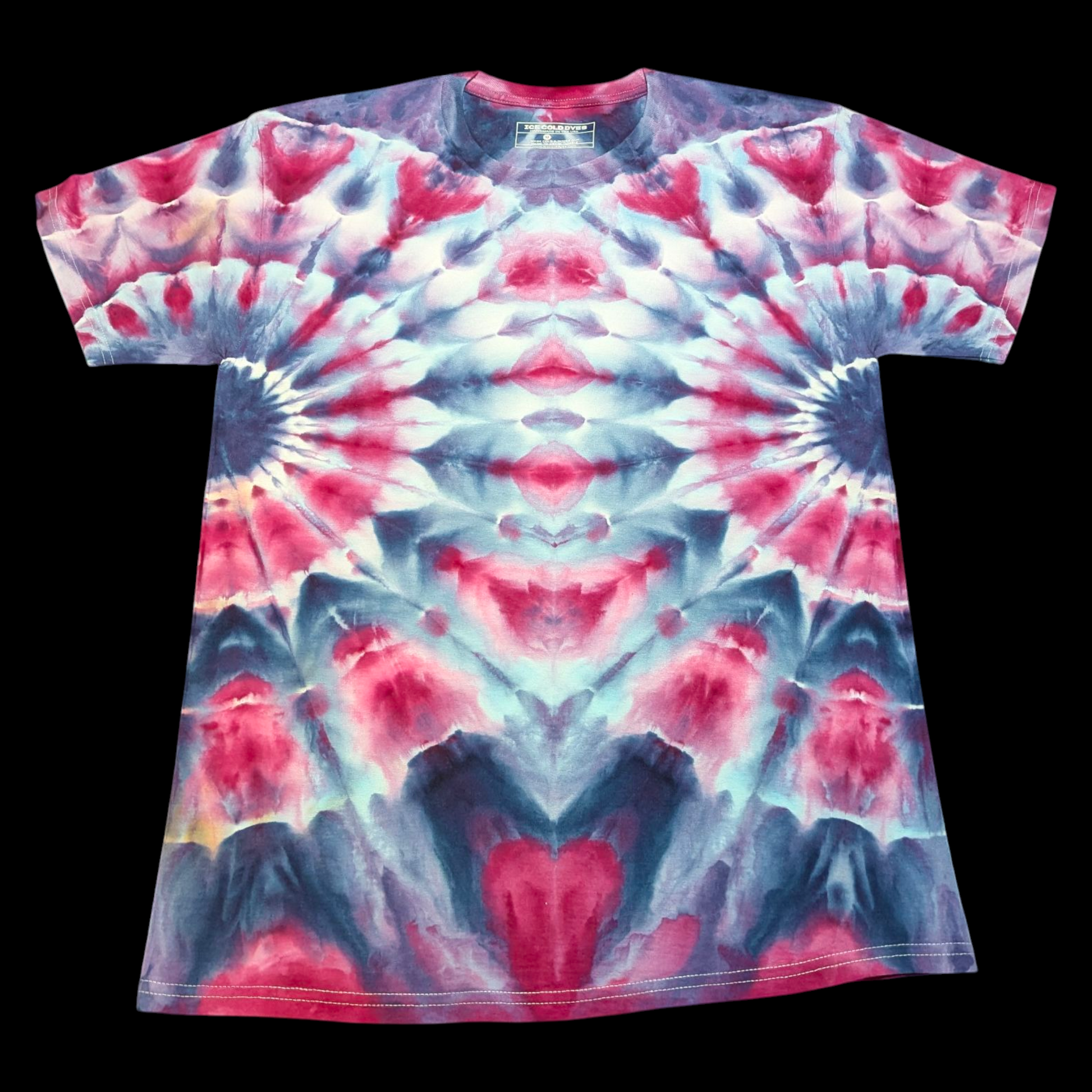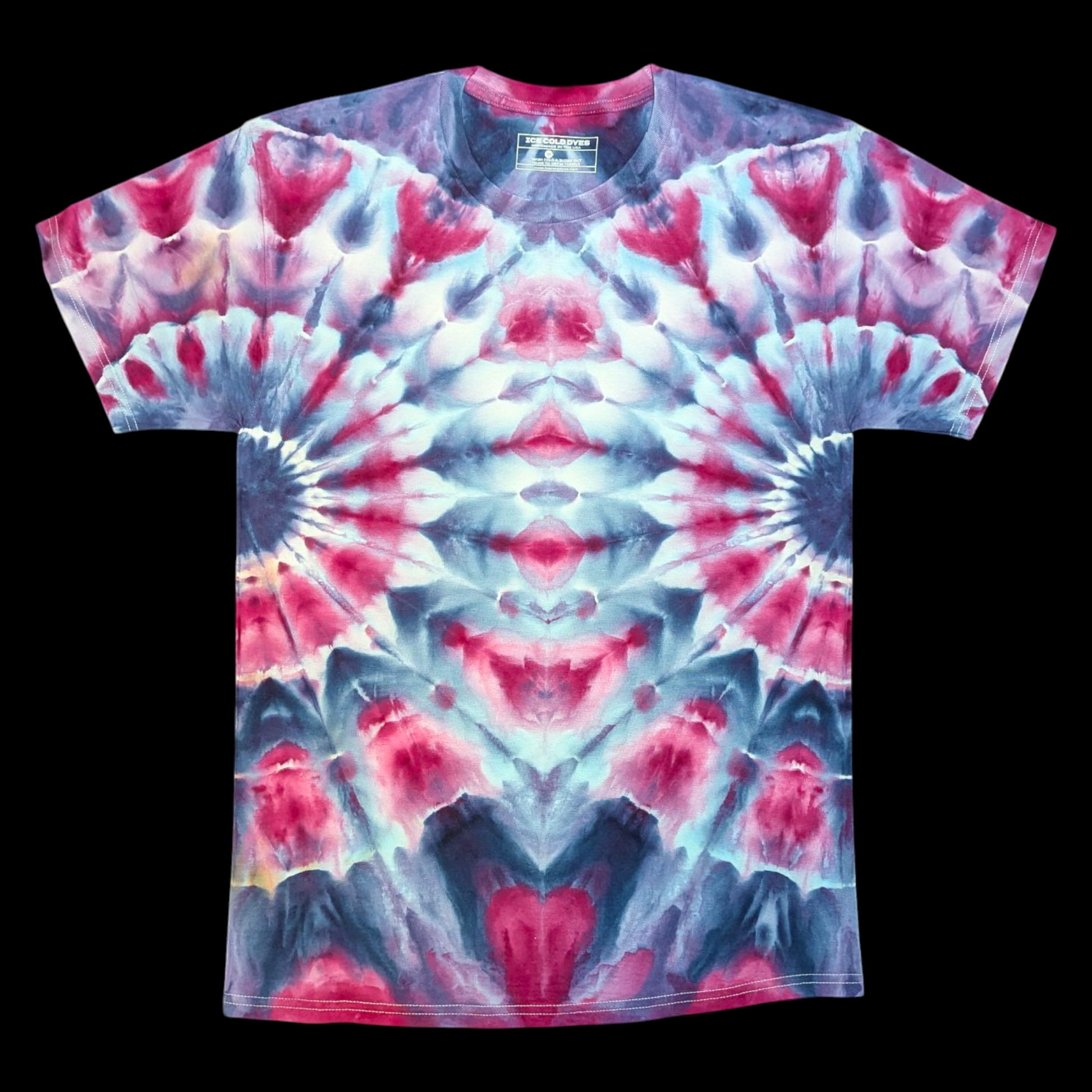Berry Archway radiates with symmetrical energy — a mirrored fusion of icy blues and molten reds that meet in the center like colliding elements. Each spiral bursts outward in rhythmic precision, forming crystalline layers that shimmer with depth and balance. The result feels both alive and frozen in time, an abstract pulse rendered through the patience of ice dye.