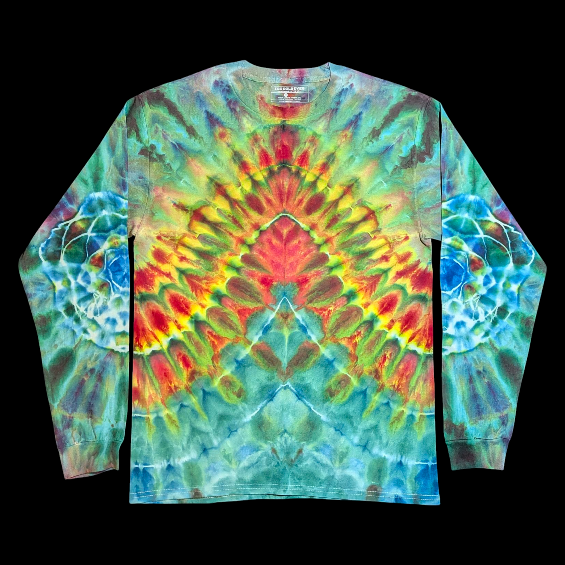 Ignite your wardrobe with Fire Mountain, a vibrant explosion of color and craftsmanship. Handcrafted through a meticulous, time-intensive ice-dye process, this piece radiates with fiery reds, molten golds, and cool oceanic blues — blending seamlessly into a burst of living color. The symmetrical design mirrors the energy of a sunburst, achieved through hours of careful folding, layering, and patient dye release as melting ice paints each unique gradient.