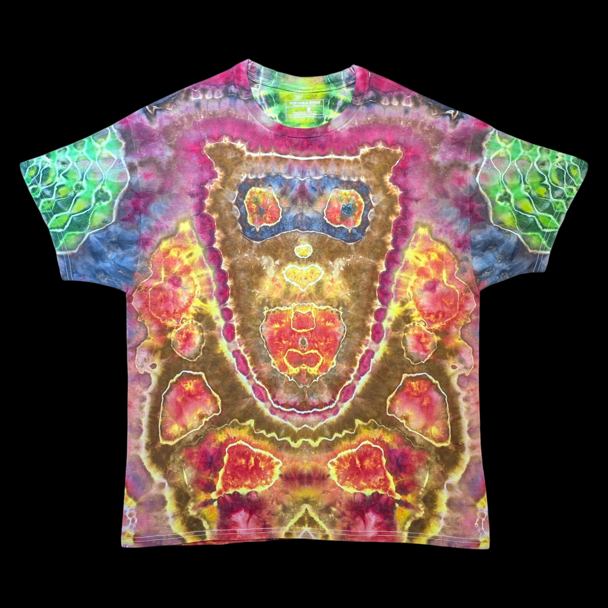Elemental Growth channels the raw energy of molten earth and forest growth, merging fiery reds and golds with deep greens and charred browns. The pattern moves like lava meeting moss, born entirely from the thoughtful HWI — where scalding water carries dye through folds of fabric to form natural symmetry and organic texture. It’s a bold, grounded piece that feels alive, complex, and entirely unrepeatable.