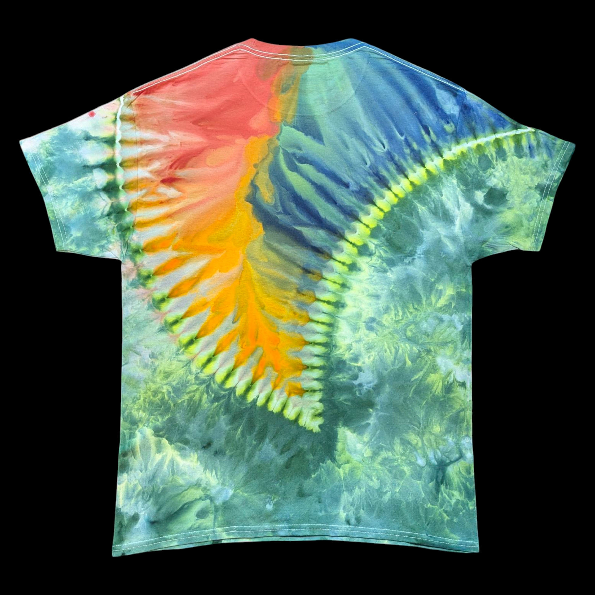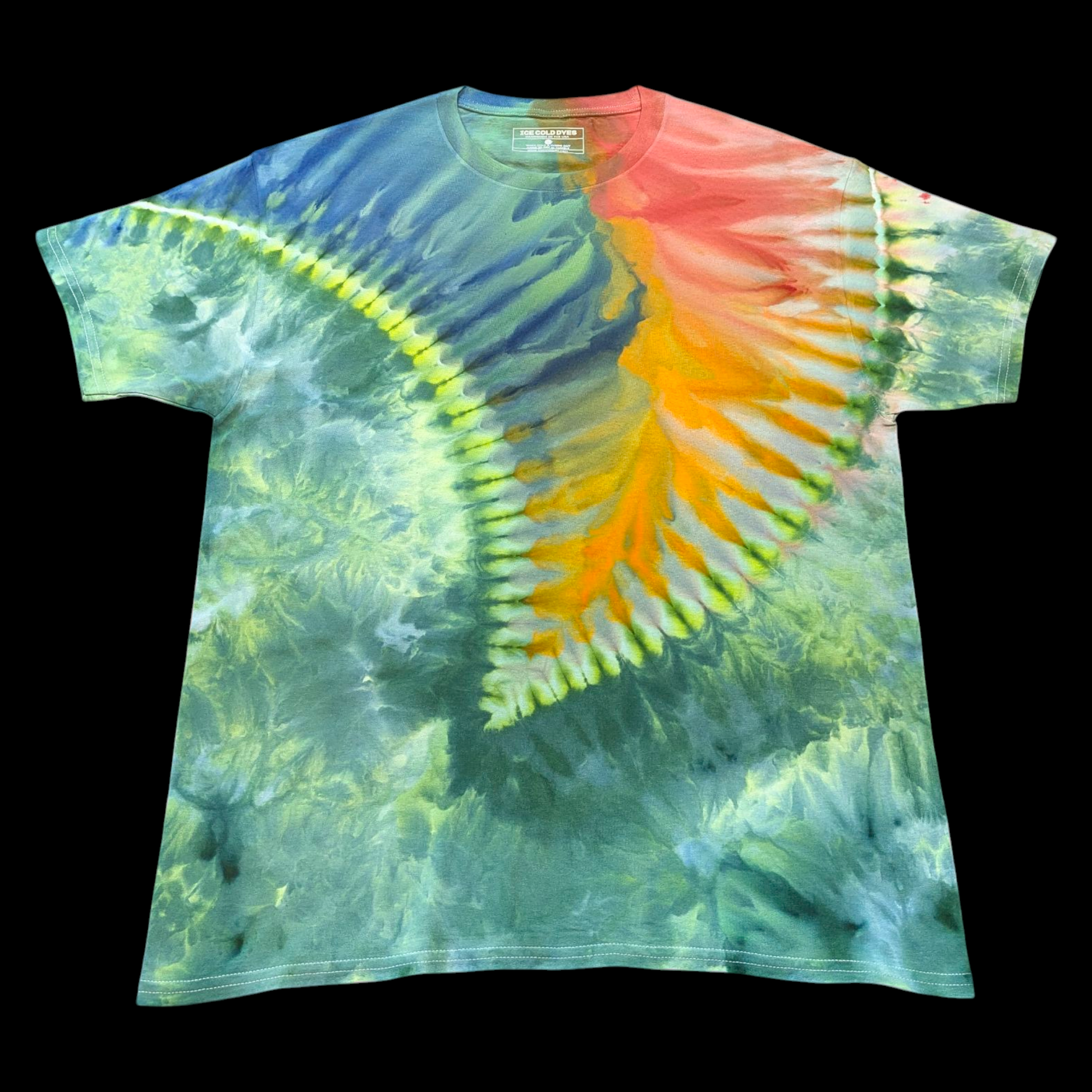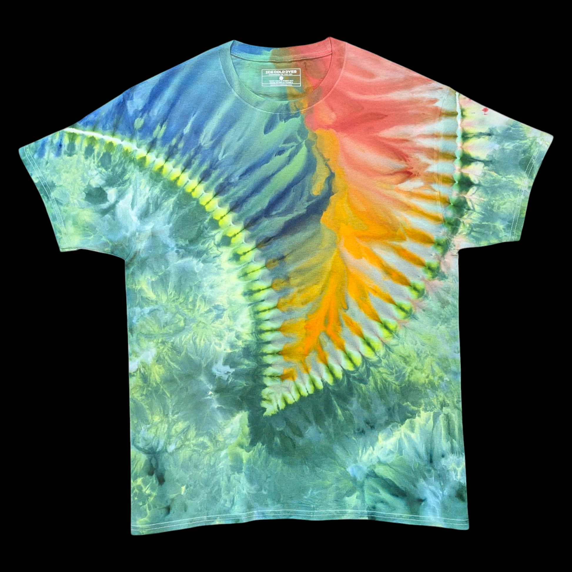 Slice of Ether blends tranquil sea greens with a molten burst of red and gold, creating a fluid, almost otherworldly energy that feels alive in motion. Formed through a slow, intentional ice-dye process, each layer of color emerges as the melting ice guides pigment across the fabric — a method that demands both patience and precision. Crafted from heavyweight 6.1oz cotton, it offers lasting comfort and structure while showcasing a truly one-of-a-kind pattern.