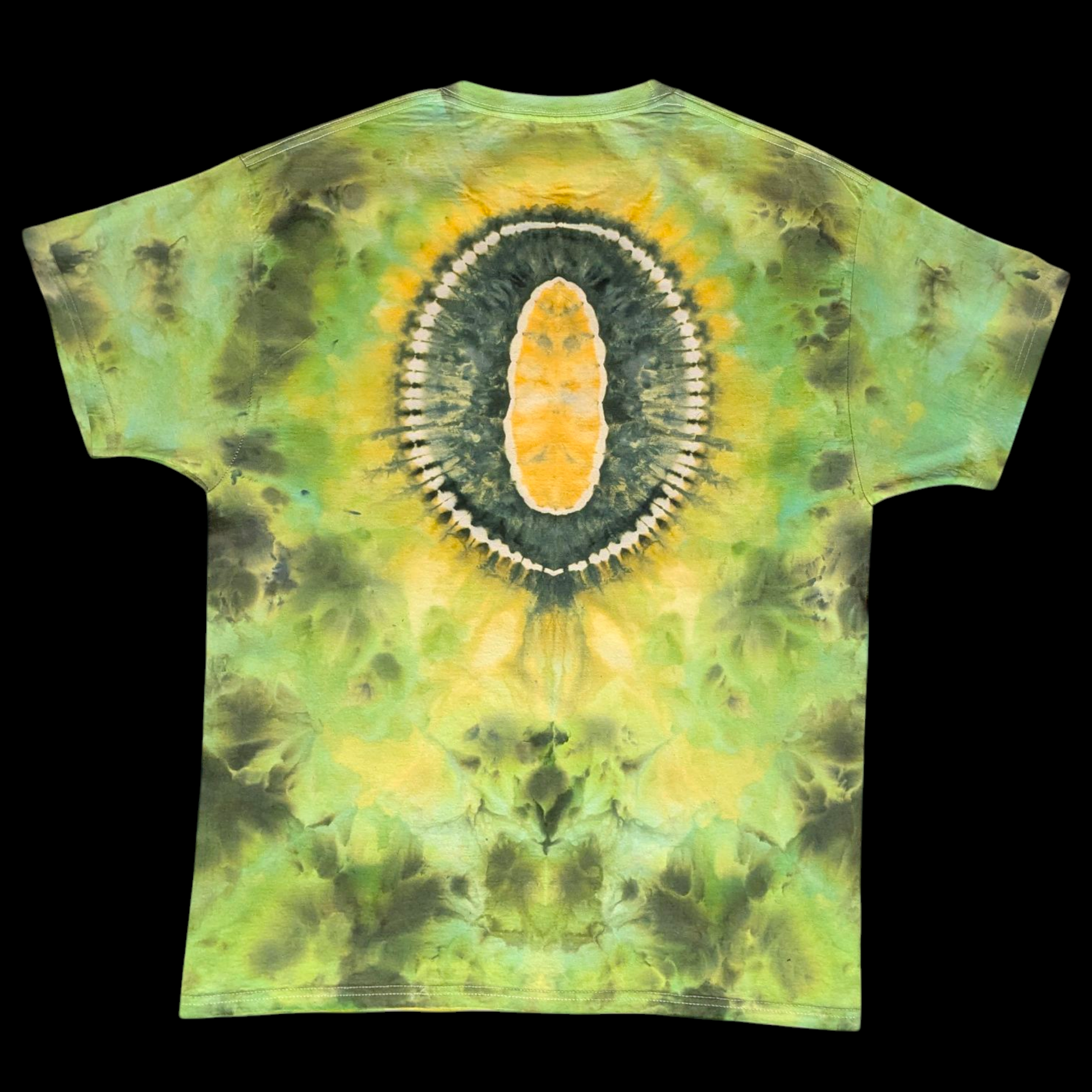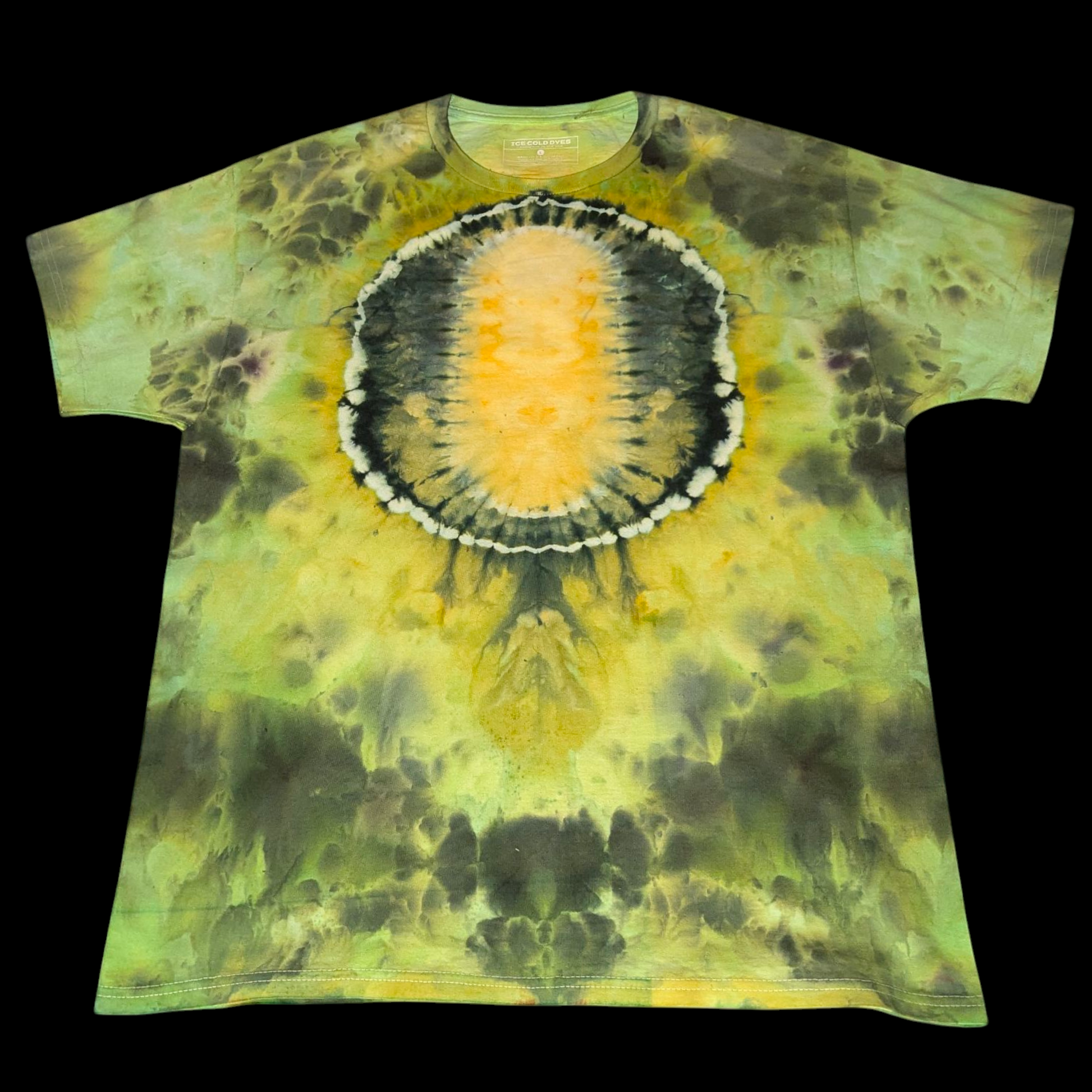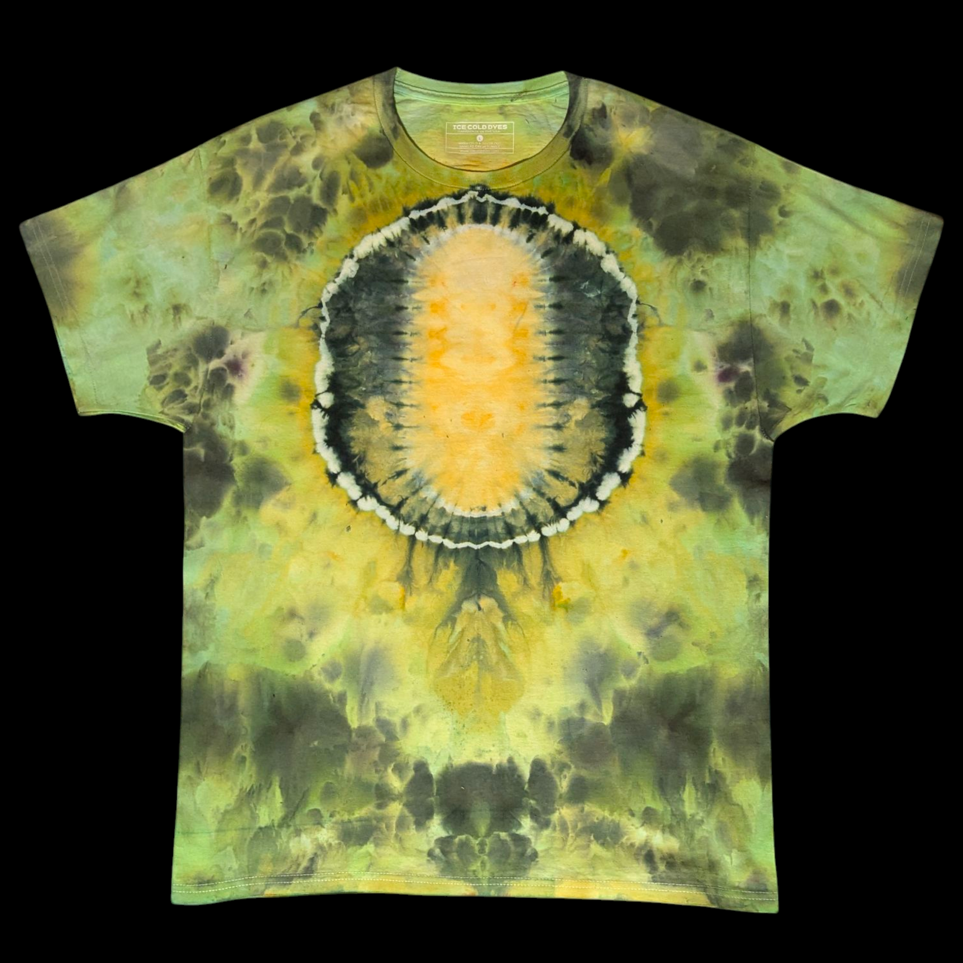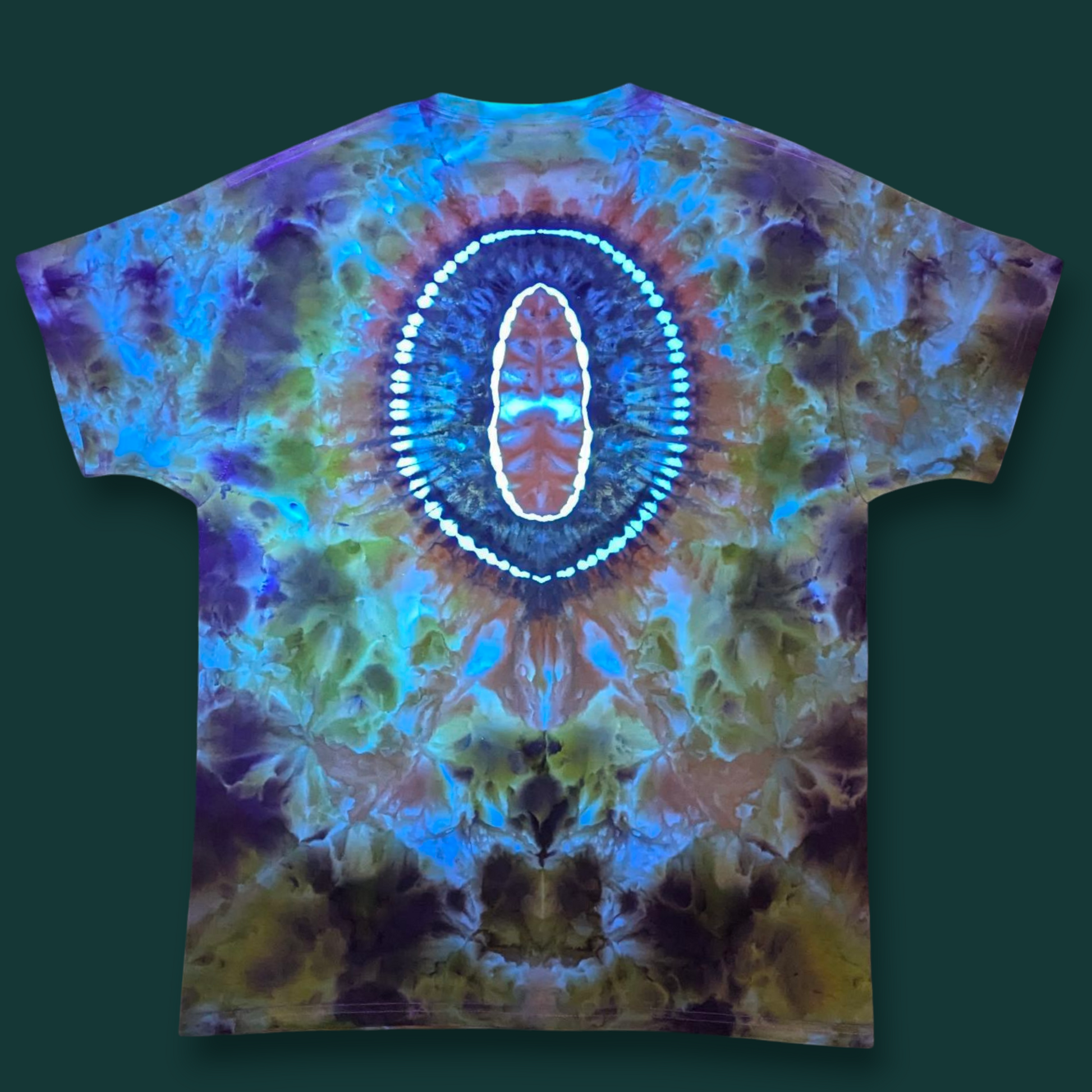 Crafted on heavyweight 6.1oz cotton using the Hot Water Irrigation (HWI) method, this one-of-a-kind piece radiates vibrant green, gold, and deep black tones that burst to life under blacklight. In daylight, it reflects the iconic colors of the Oregon Ducks; under UV, it transforms into a glowing cosmic halo — a living symbol of movement, school spirit, and psychedelic craftsmanship.