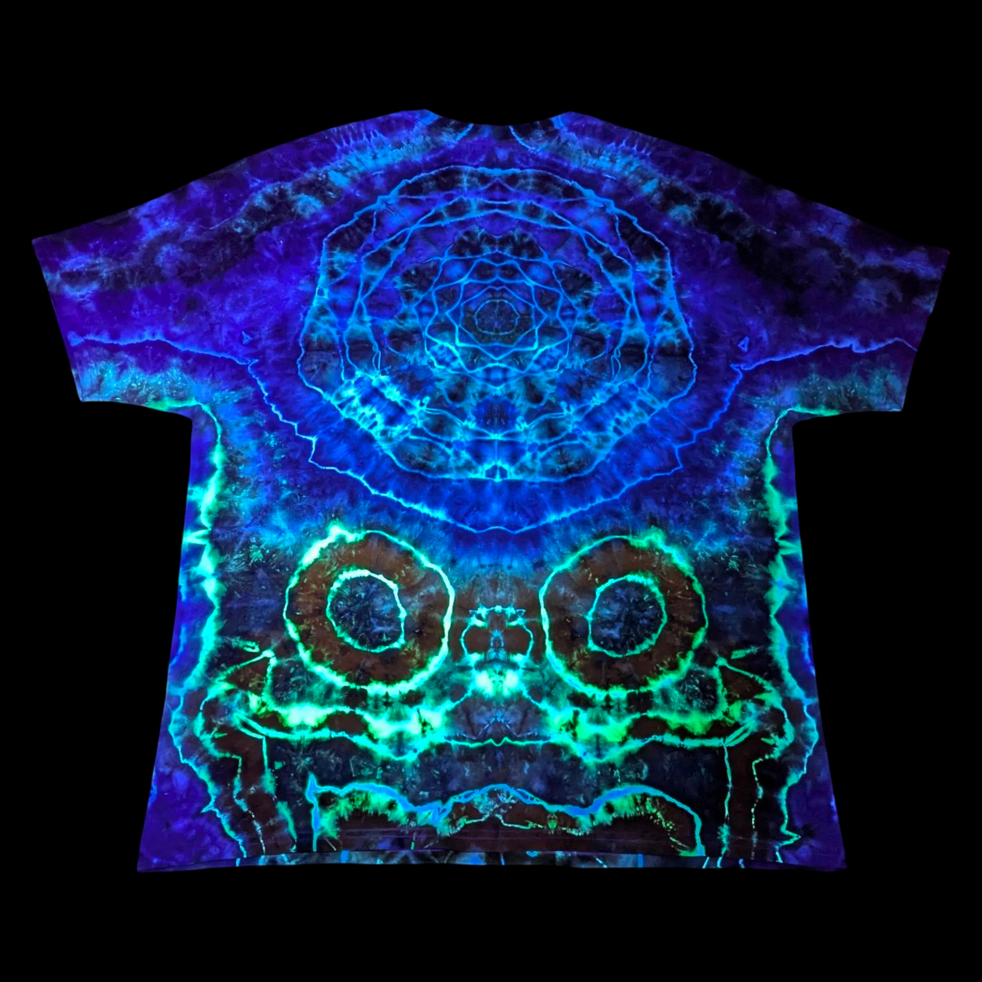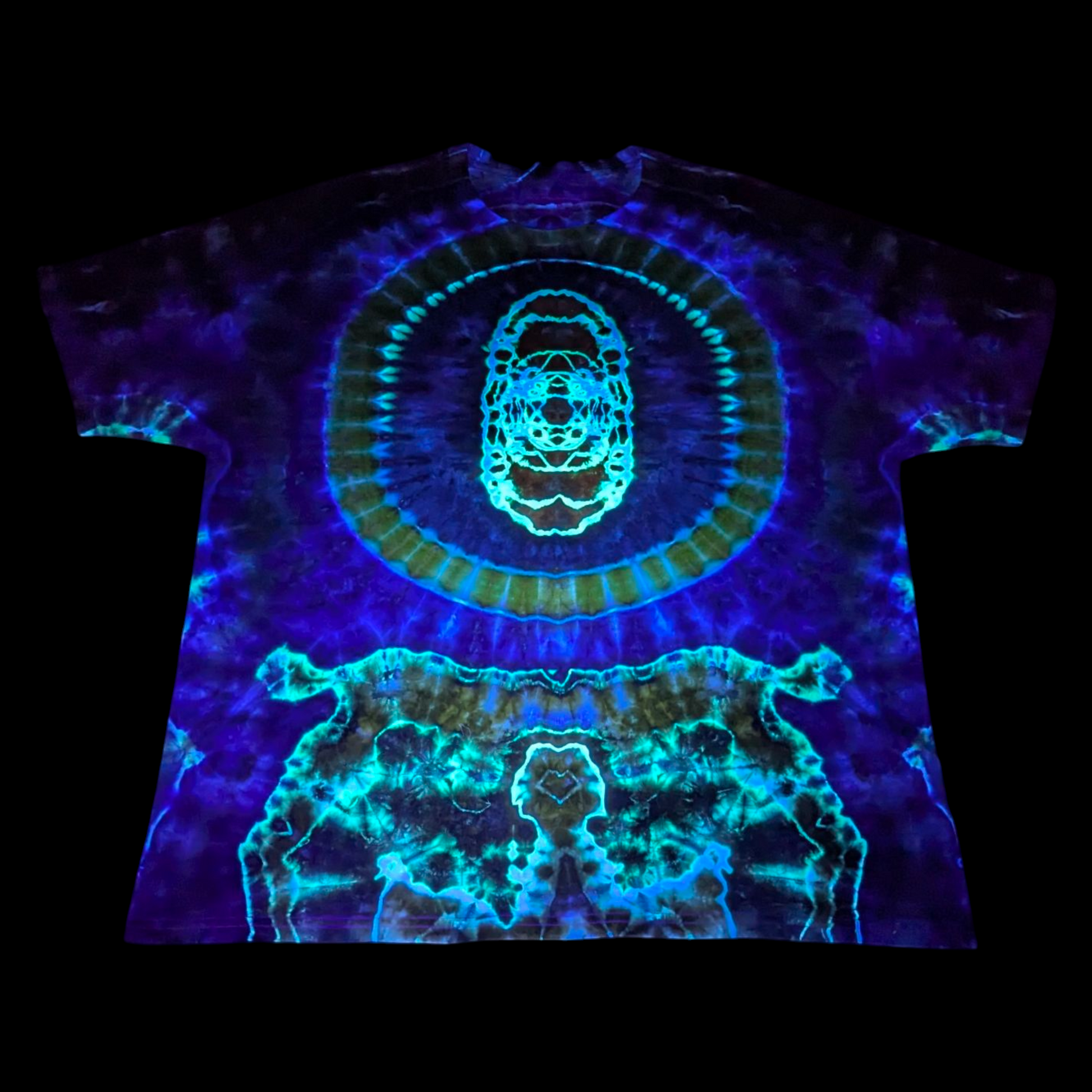 This 5.2oz 100% cotton shirt was created using a hot water irrigation (HWI) process, producing rich layers of green and yellow that glow vividly under blacklight. Every ring and shape flows with organic motion — a tribute to both psychedelic artistry and collegiate pride. No two pieces will ever look alike.
