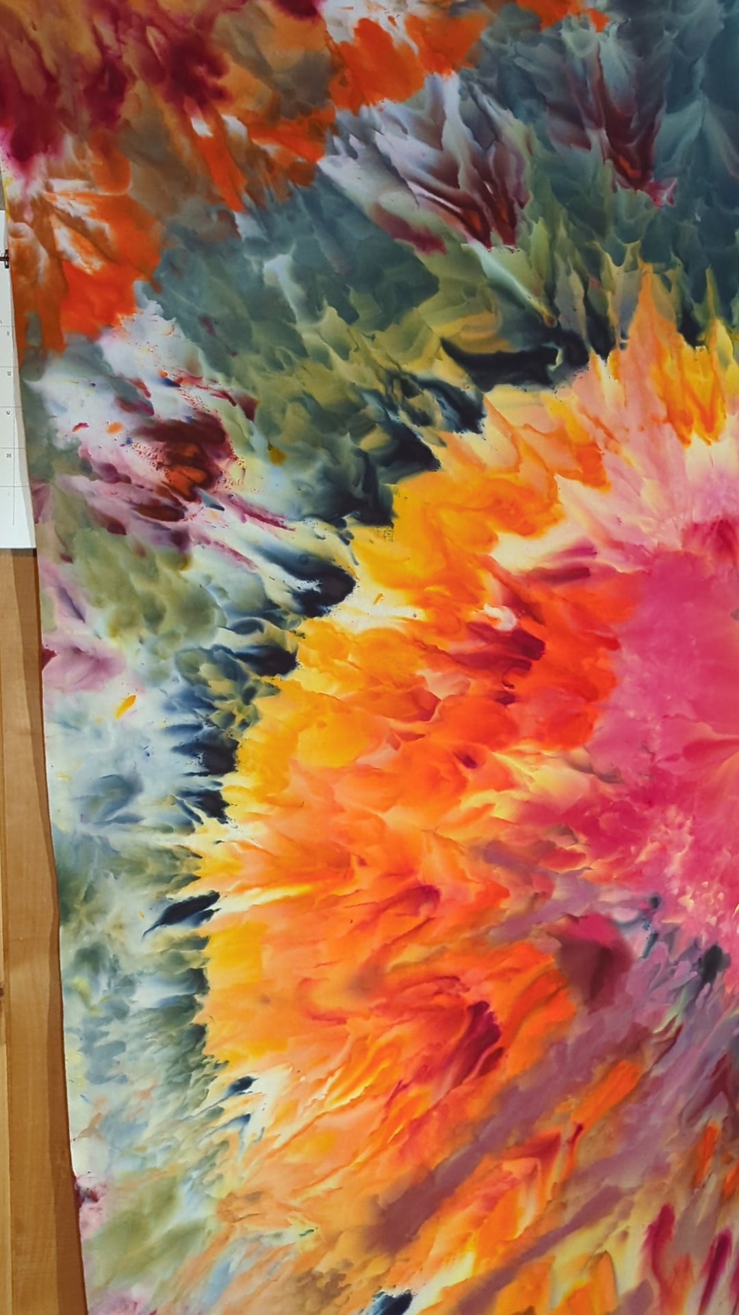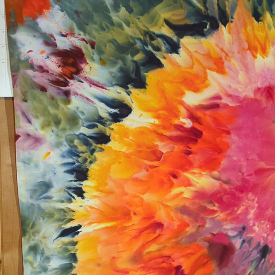 Fireburst Flow radiates with fiery warmth — molten reds and glowing oranges spiral outward into deep charcoal and soft grey, capturing the essence of a flame frozen mid-motion. Created through the slow, intentional ice-dye process, melting ice guides pigment in unpredictable, organic flows, forming natural gradients that resemble heat waves and smoke. The result is a tapestry alive with depth and texture — a perfect fusion of chaos and control.