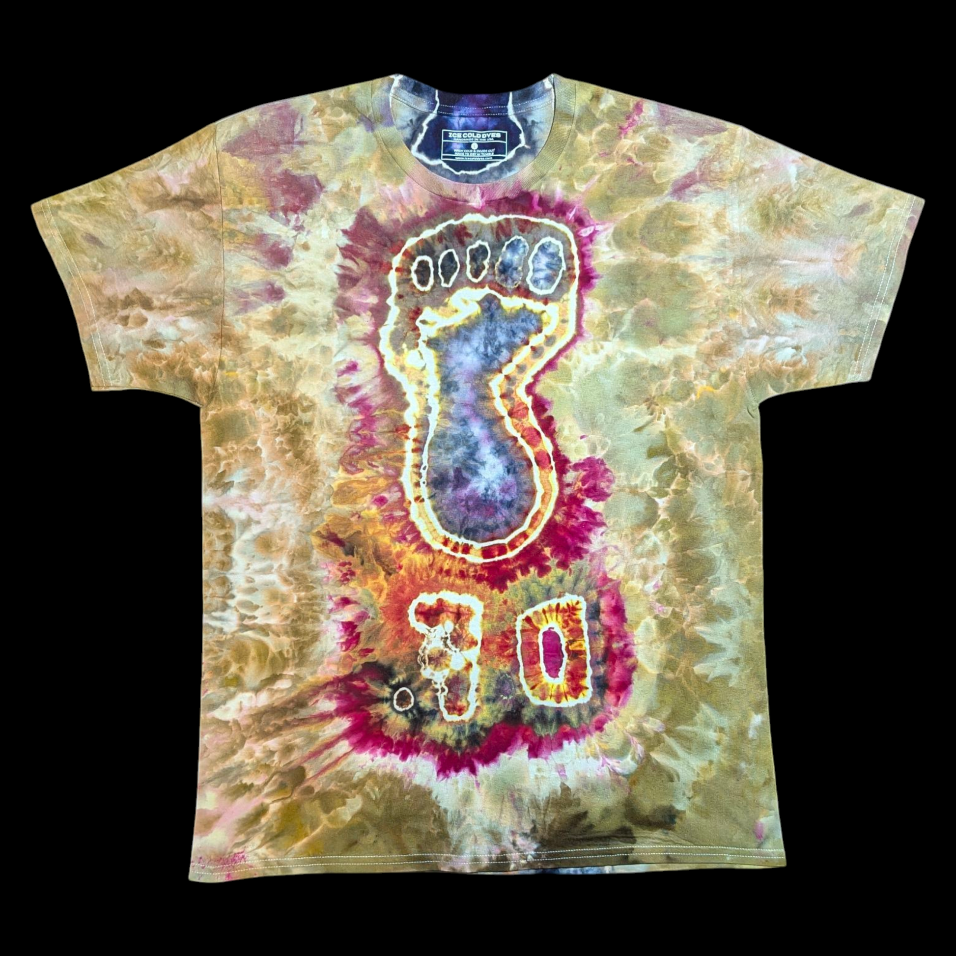 Fragments of deep blue scatter against sandy gold, flowing like waves against a hidden shoreline. The pigments settled slowly, building a design that feels like a map of an imagined island. Dyed by hand on 100% cotton, this shirt is wearable art that carries the calm strength of the sea.