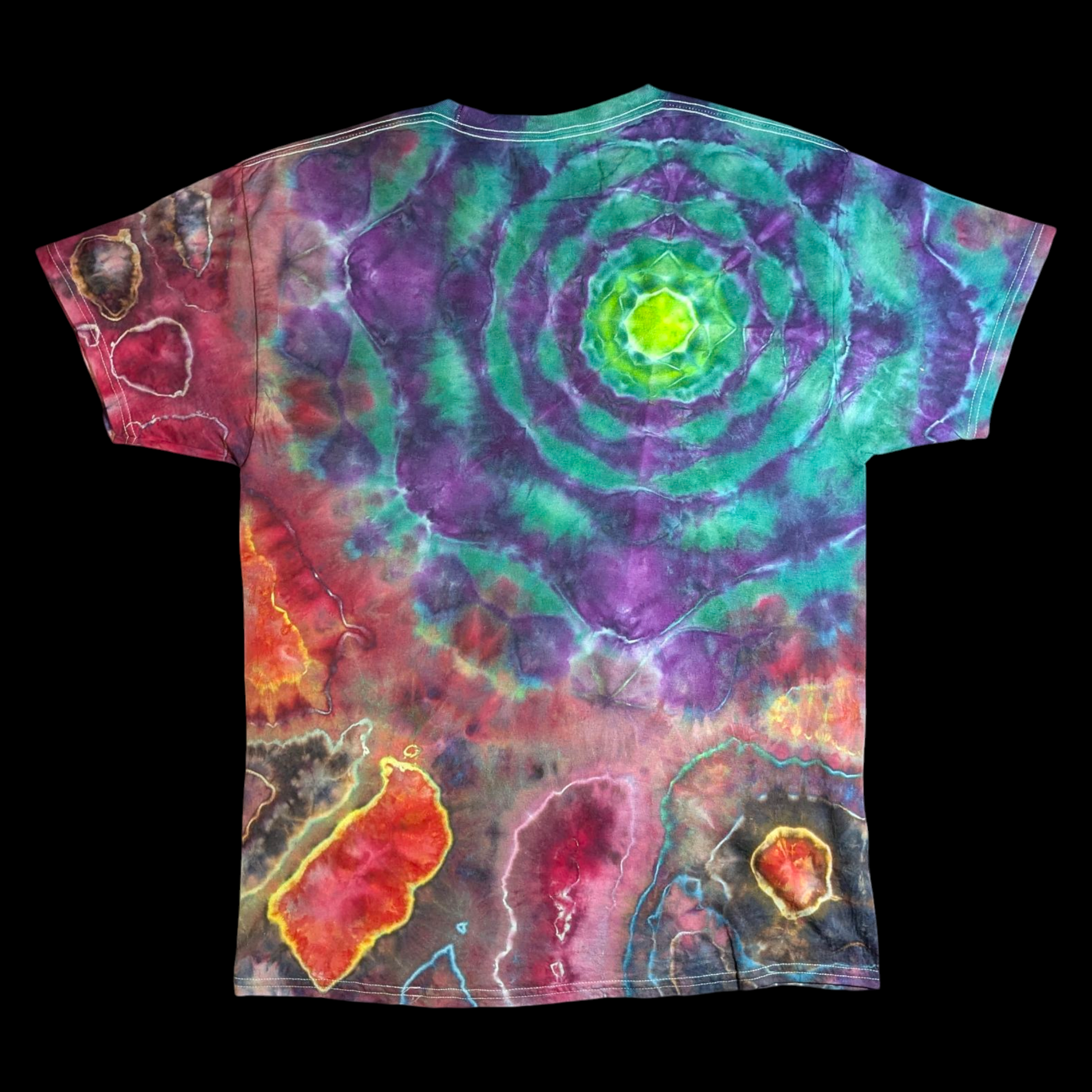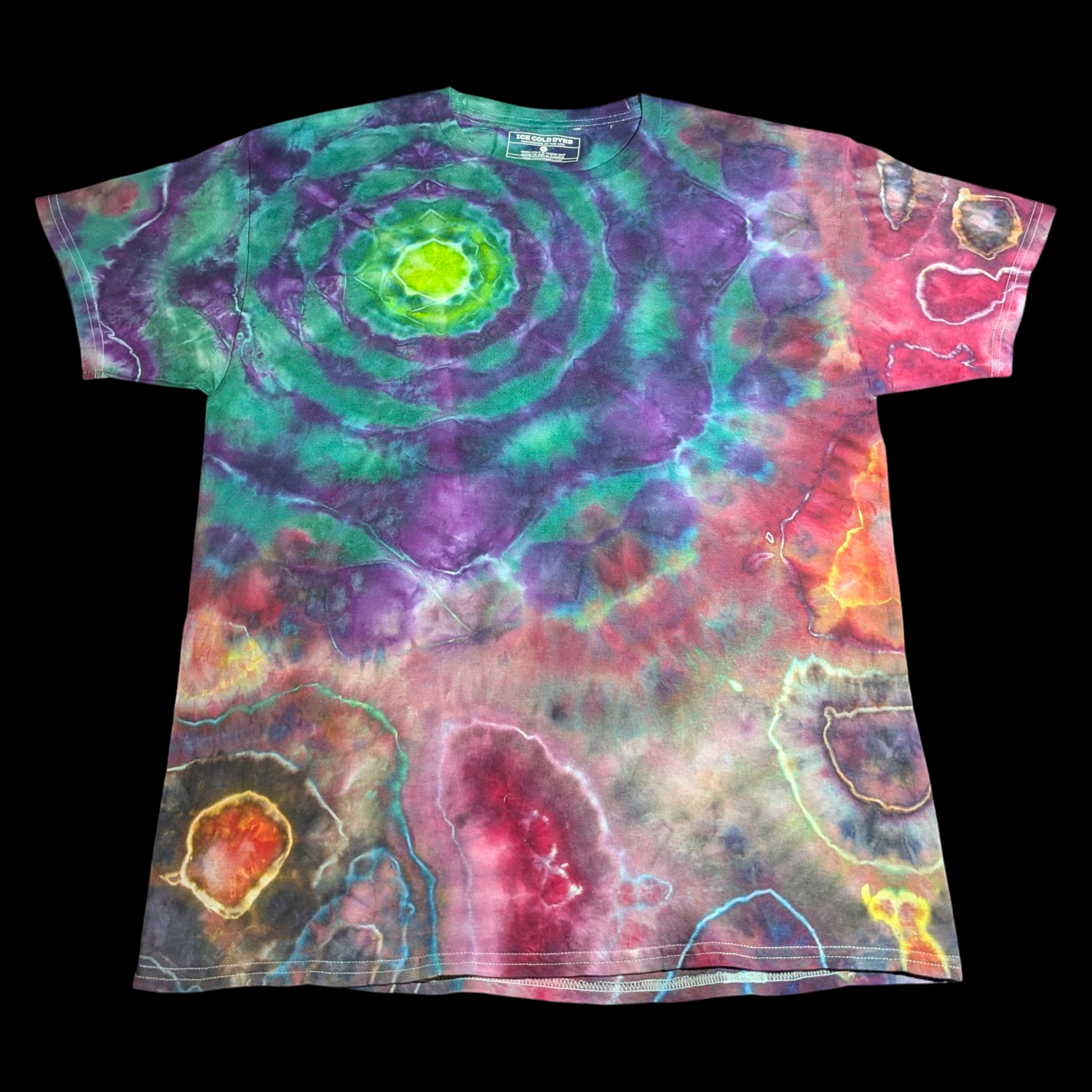 Emerald Storm unfolds in hypnotic waves of emerald, violet, and magenta — a radiant vortex that pulls the eye toward its luminous green core. Subtle halos of red, amber, and indigo ripple outward like geological layers or energy fields frozen in motion. Created through the hot water irrigation dye method, every line and hue merges with intention, forming a balance between chaos and clarity.