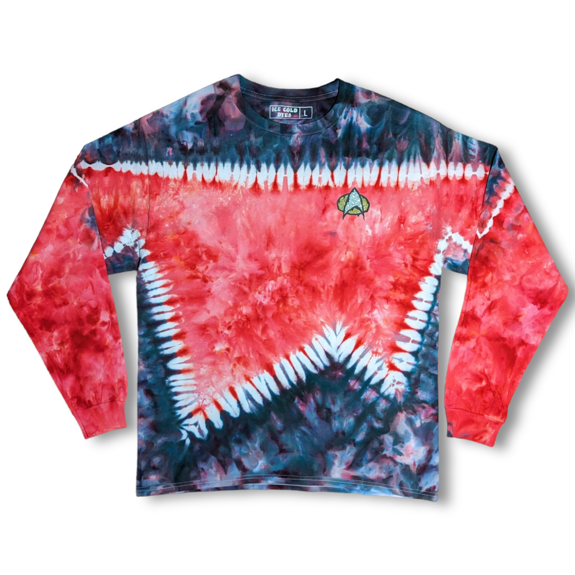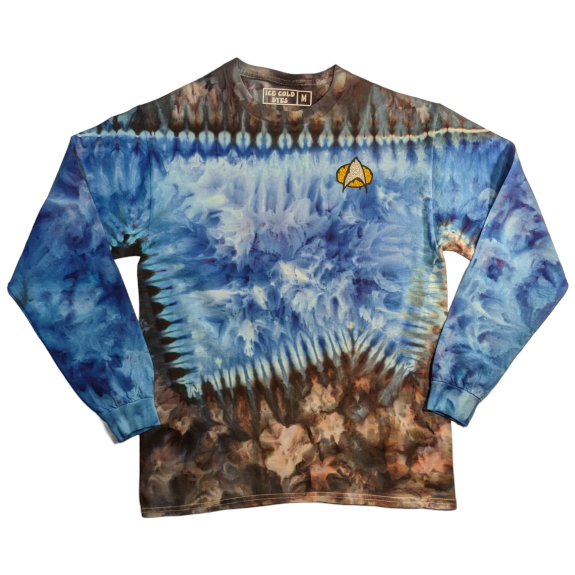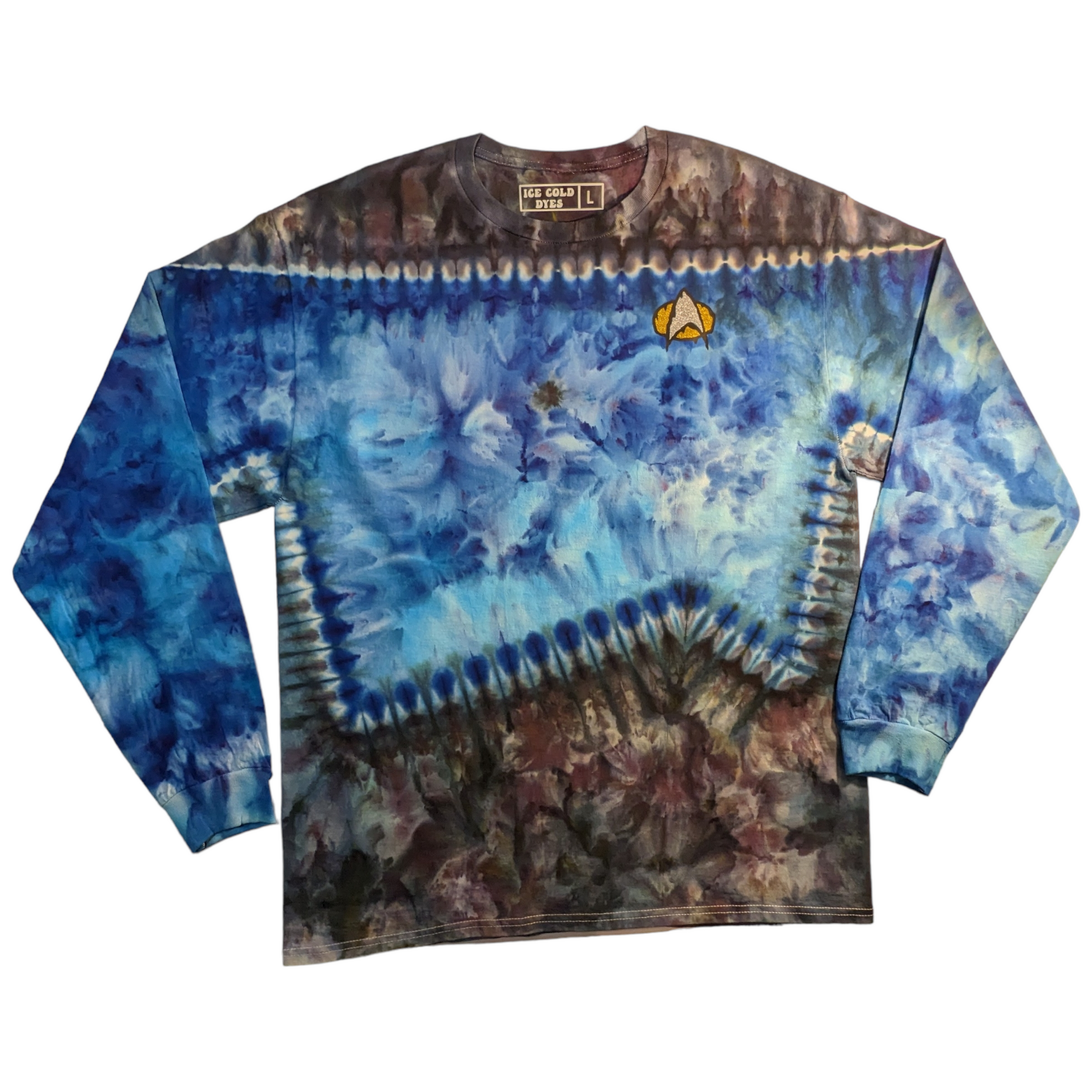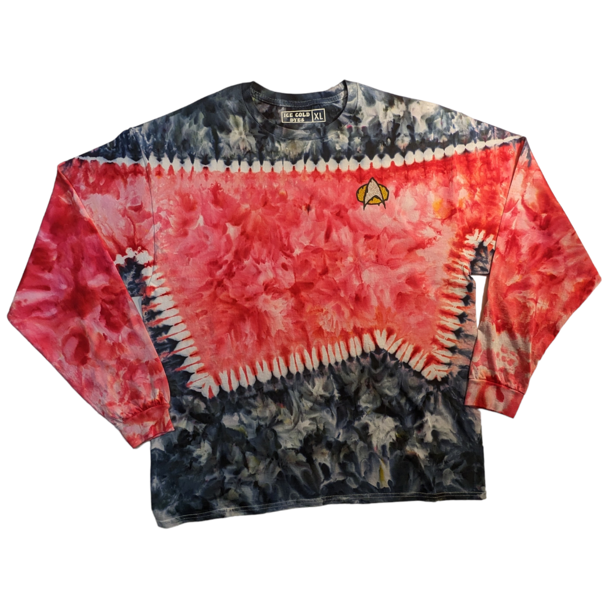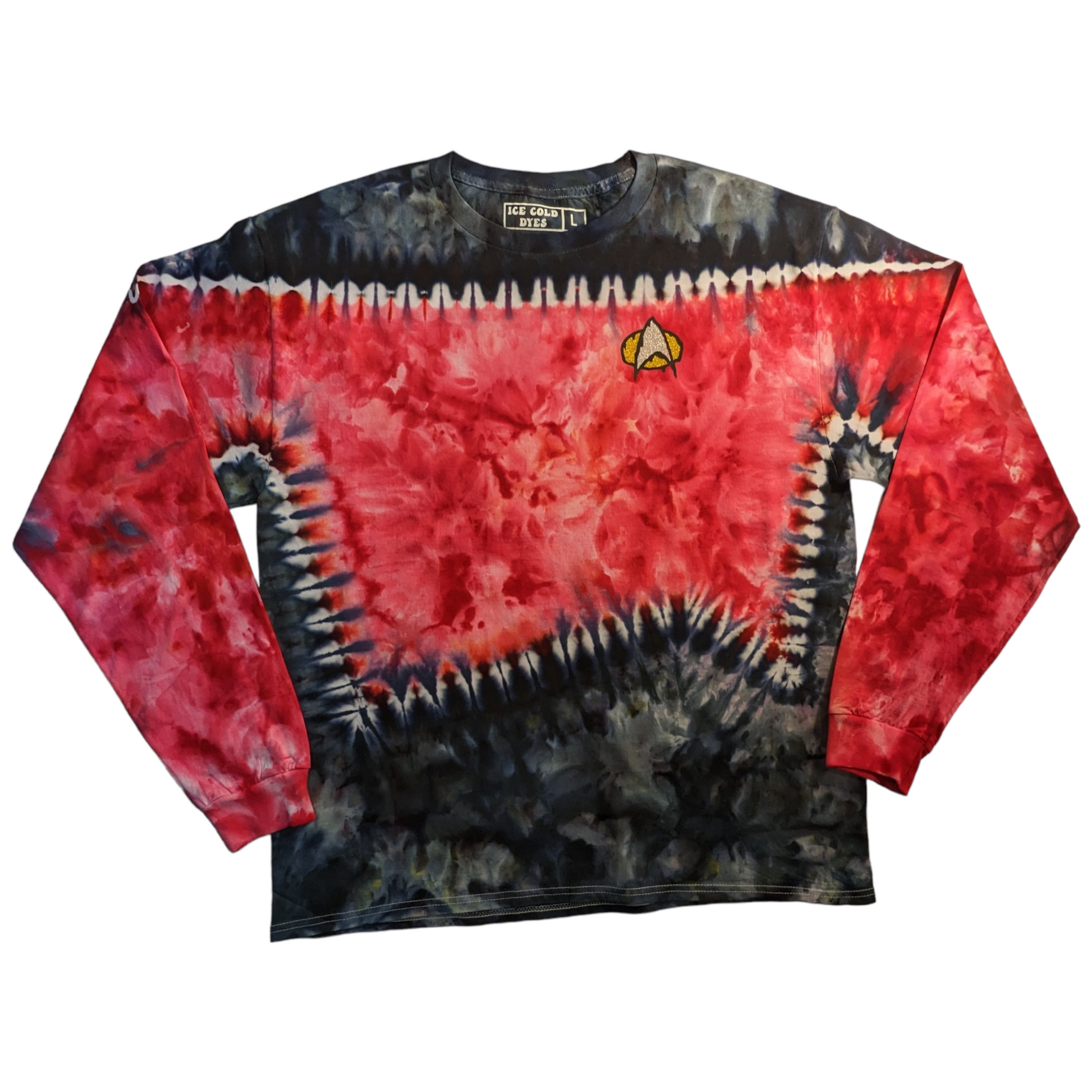 These long sleeve Star Trek TNG uniform inspired shirts are as unique as you are. These are dyed by hand to order on heavy duty 6.1oz cotton, and feature a melty communicator badge. Explore strange new worlds at the next comic con, festival, or binge your favorite series at home. See short sleeve options here. Also check out the alternate colors.