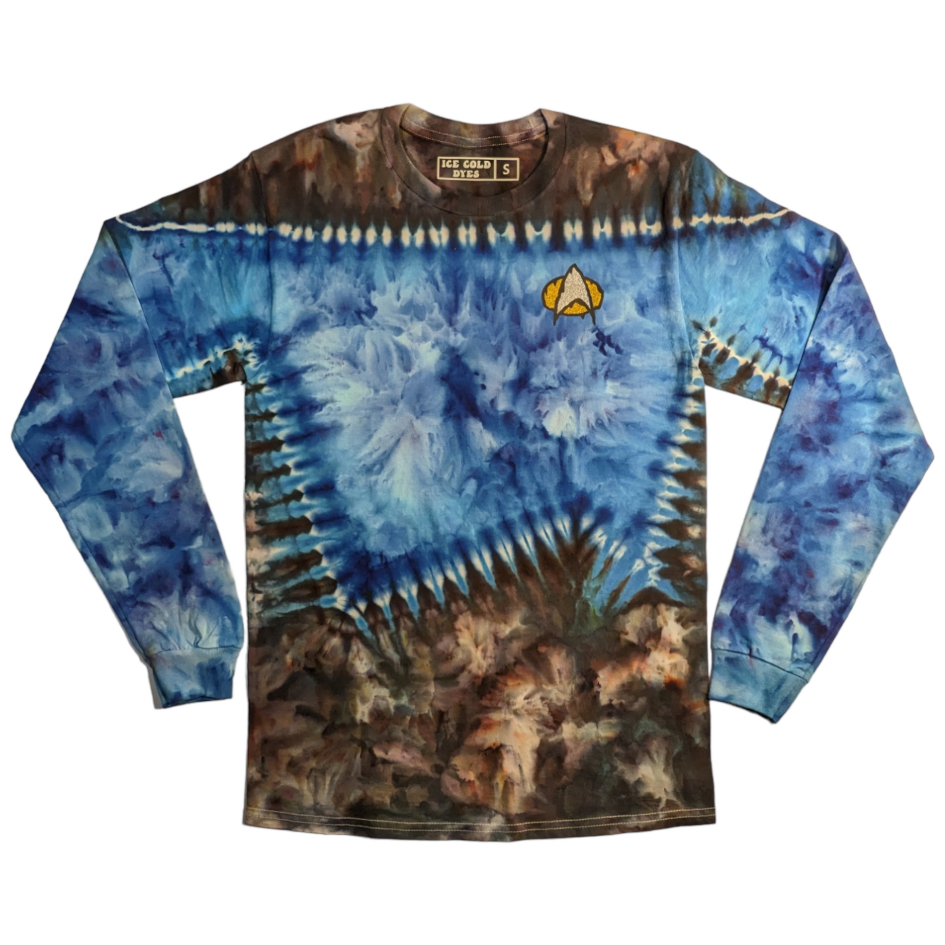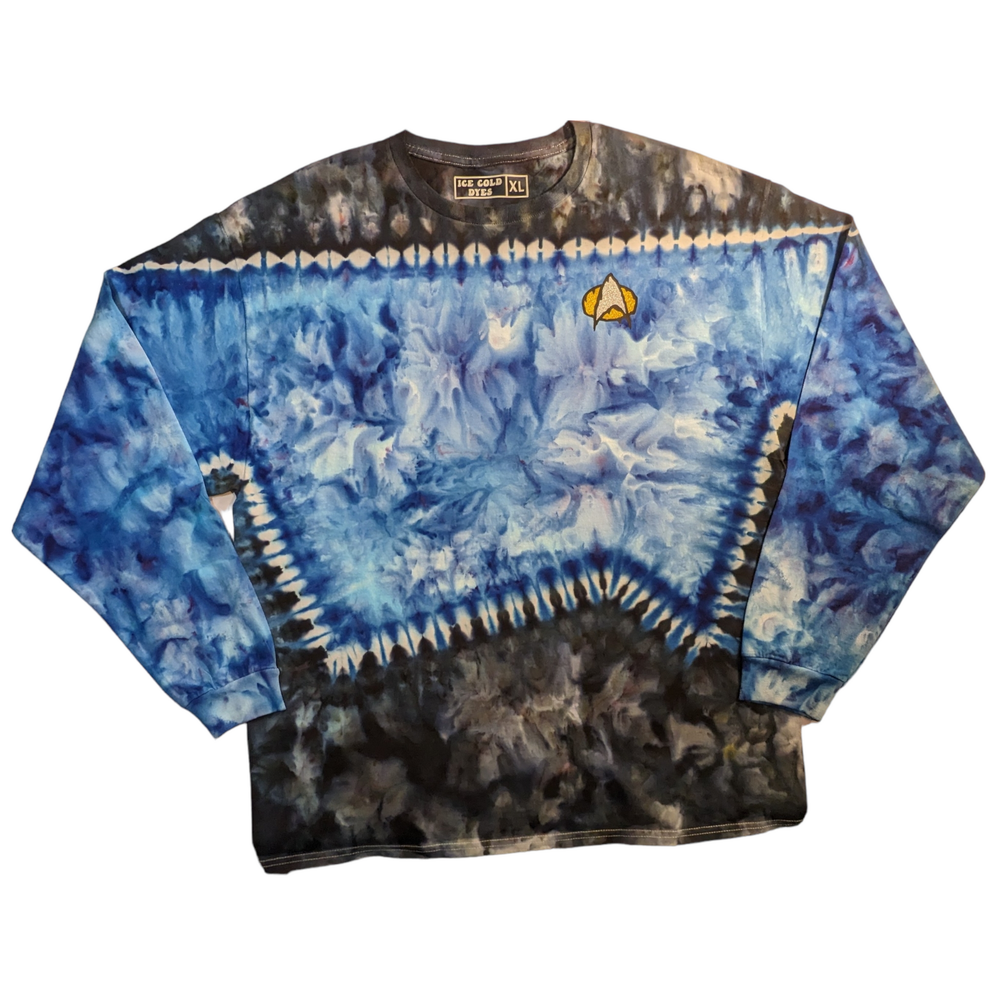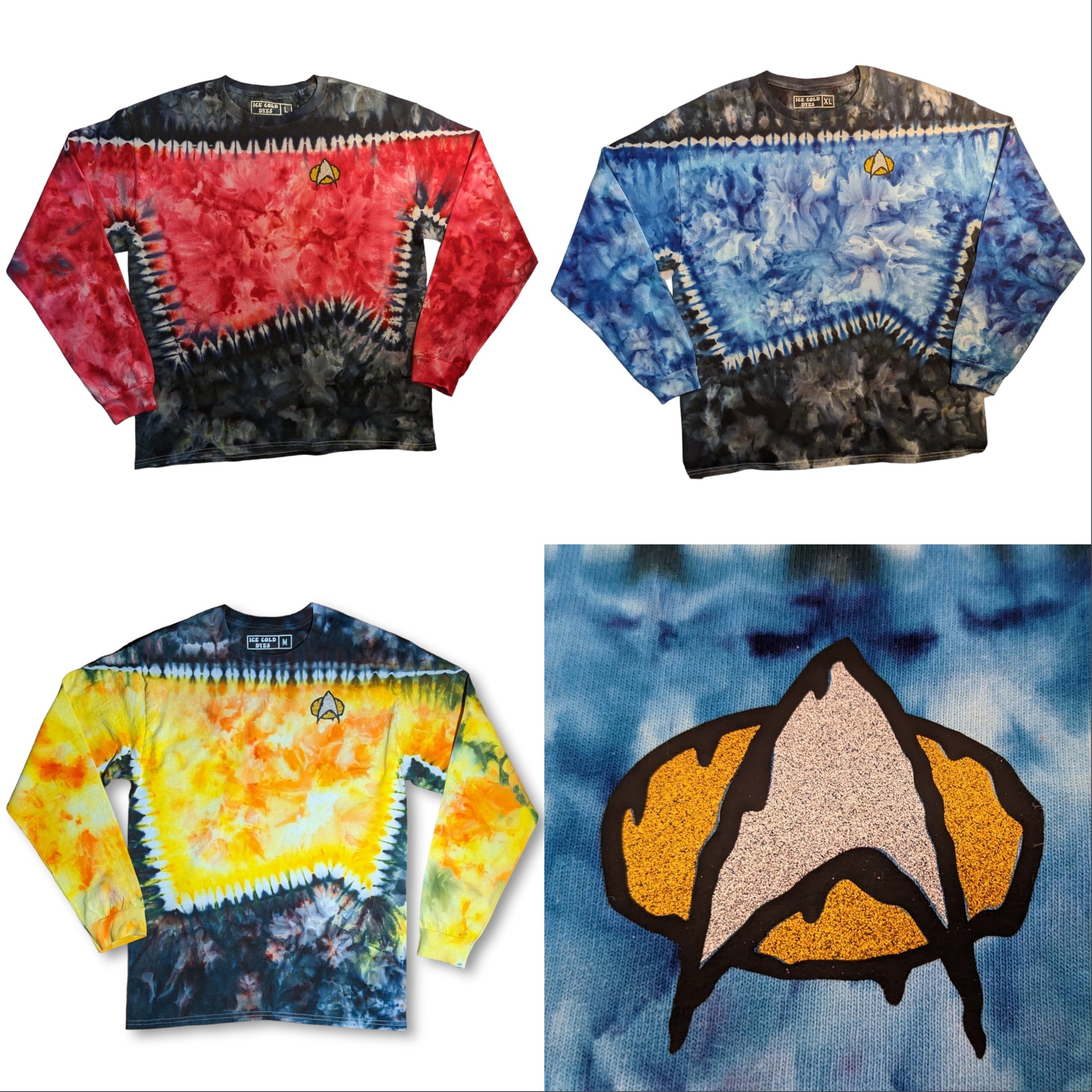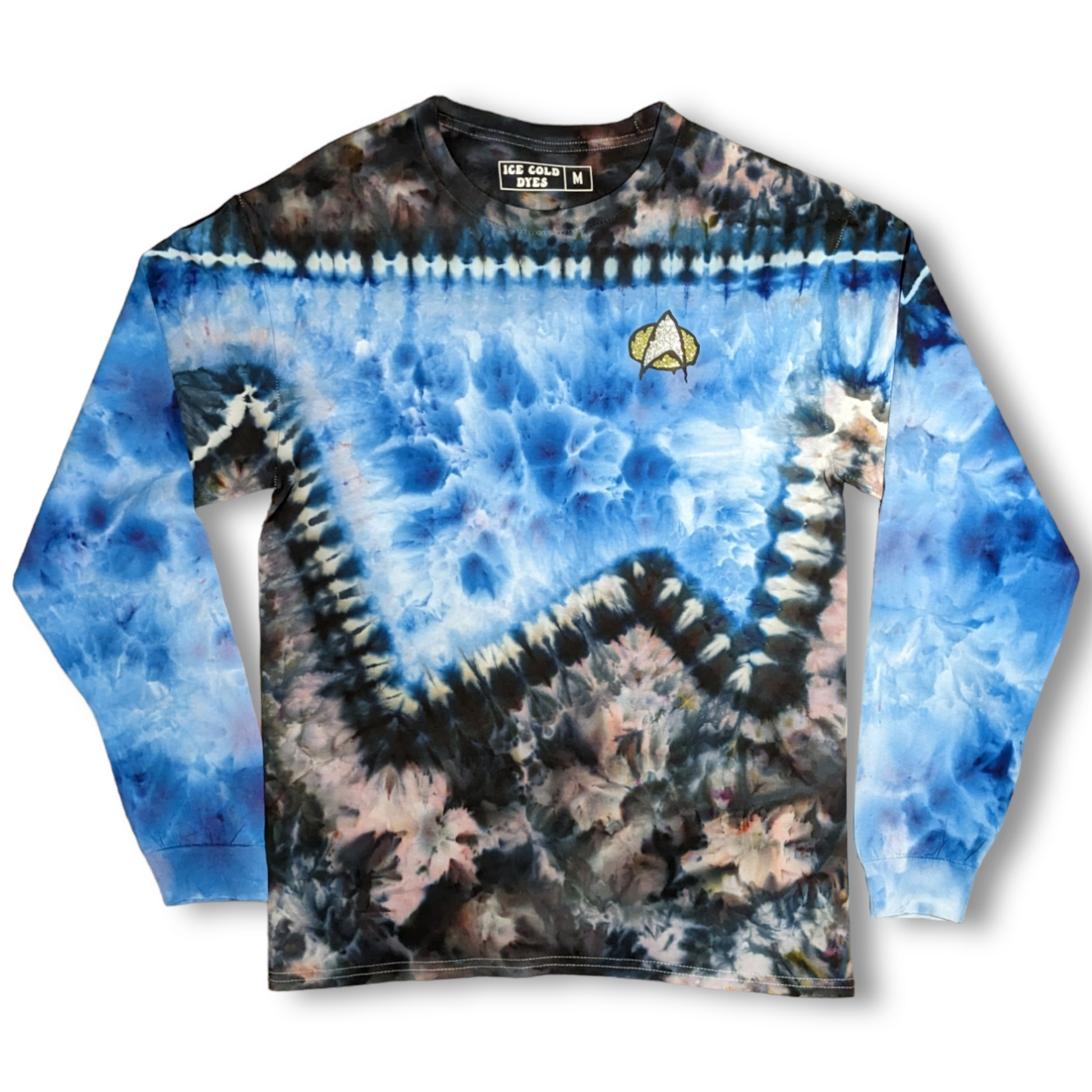 These long sleeve Star Trek TNG uniform inspired shirts are as unique as you are. These are dyed by hand to order on heavy duty 6.1oz cotton, and feature a melty communicator badge. Explore strange new worlds at the next comic con, festival, or binge your favorite series at home. See short sleeve options here. Also check out the alternate colors.