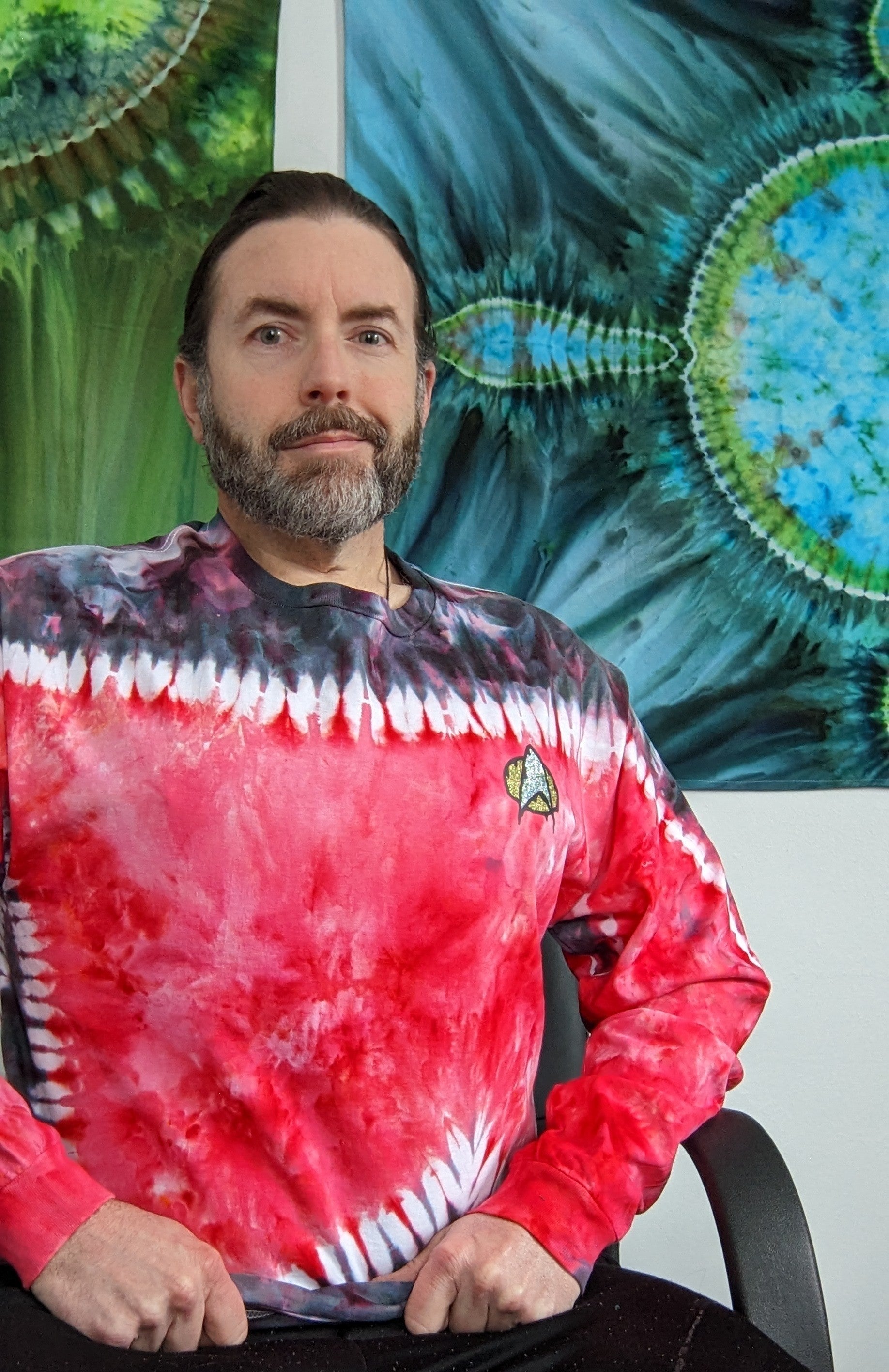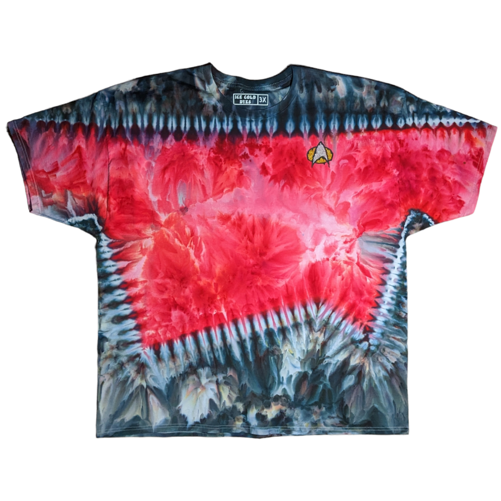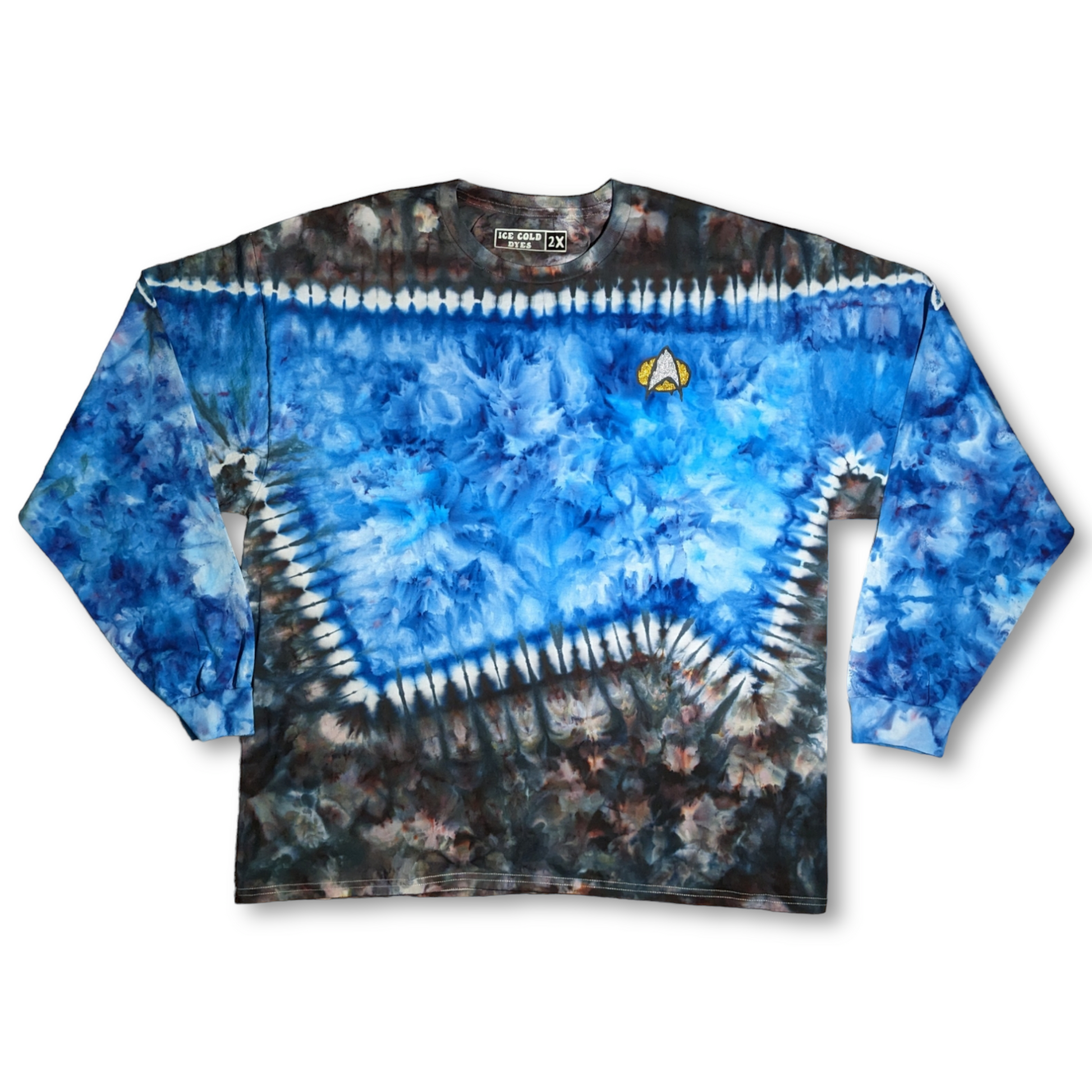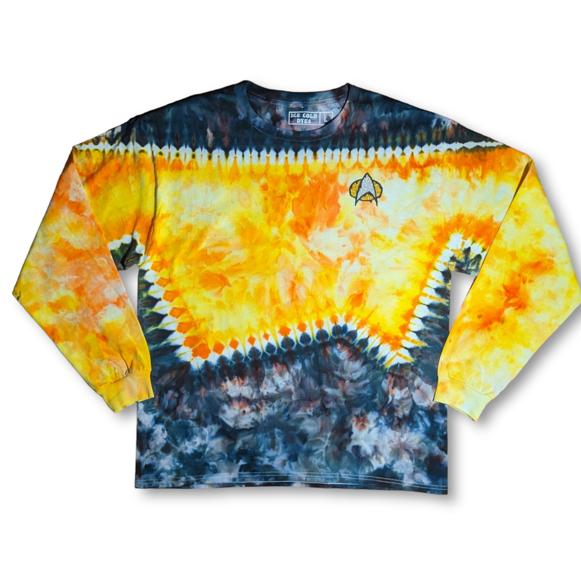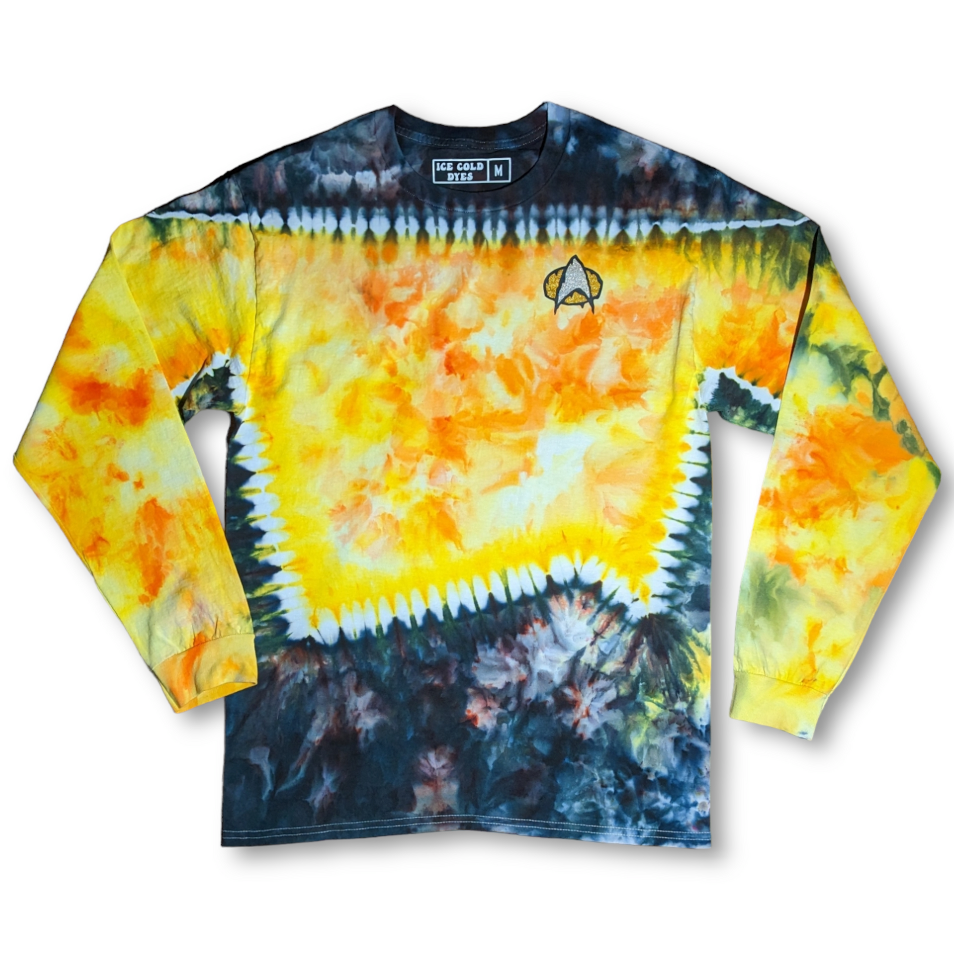 These long sleeve Star Trek TNG uniform inspired shirts are as unique as you are. These are dyed by hand to order on heavy duty 6.1oz cotton, and feature a melty communicator badge. Explore strange new worlds at the next comic con, festival, or binge your favorite series at home. See short sleeve options here. Also check out the alternate colors.