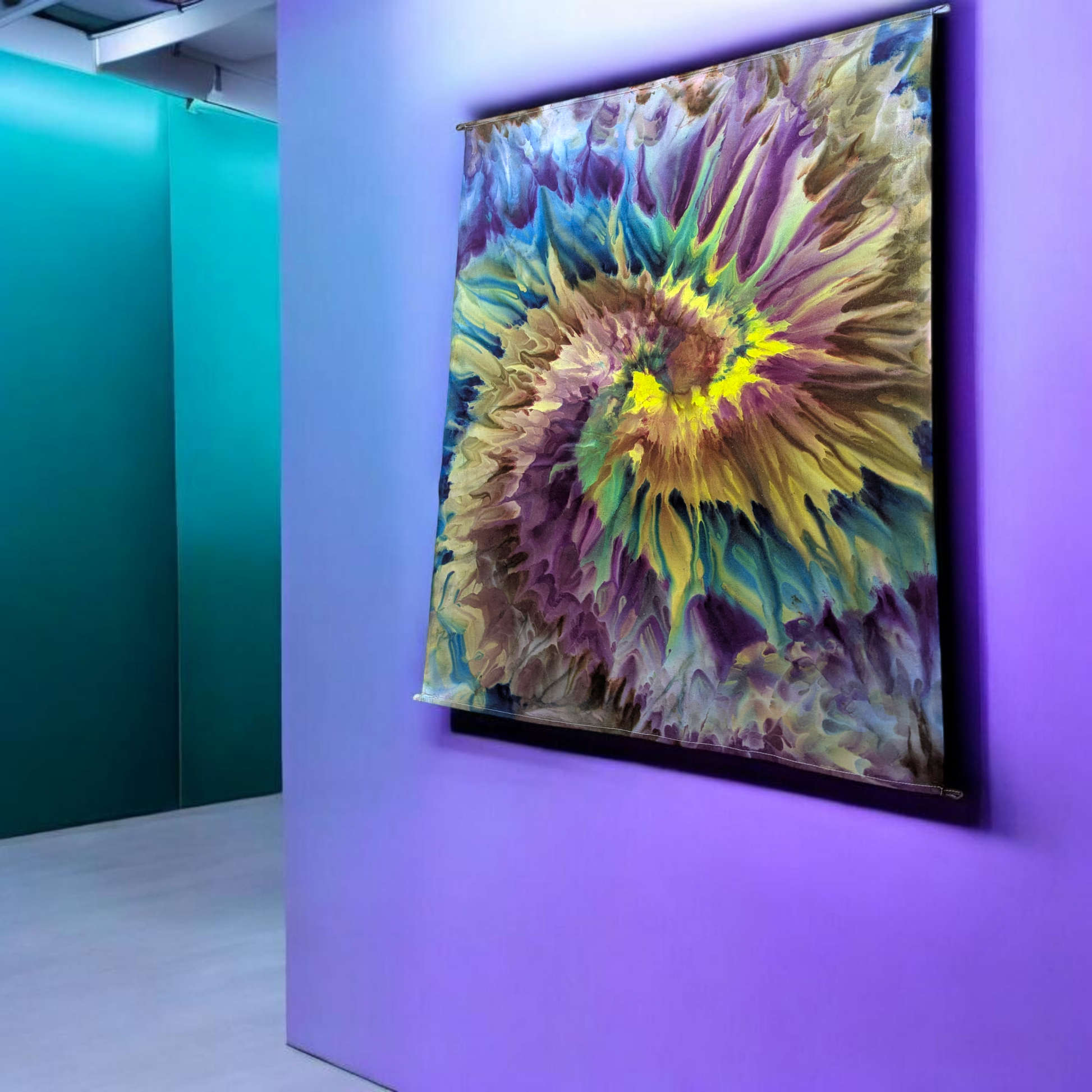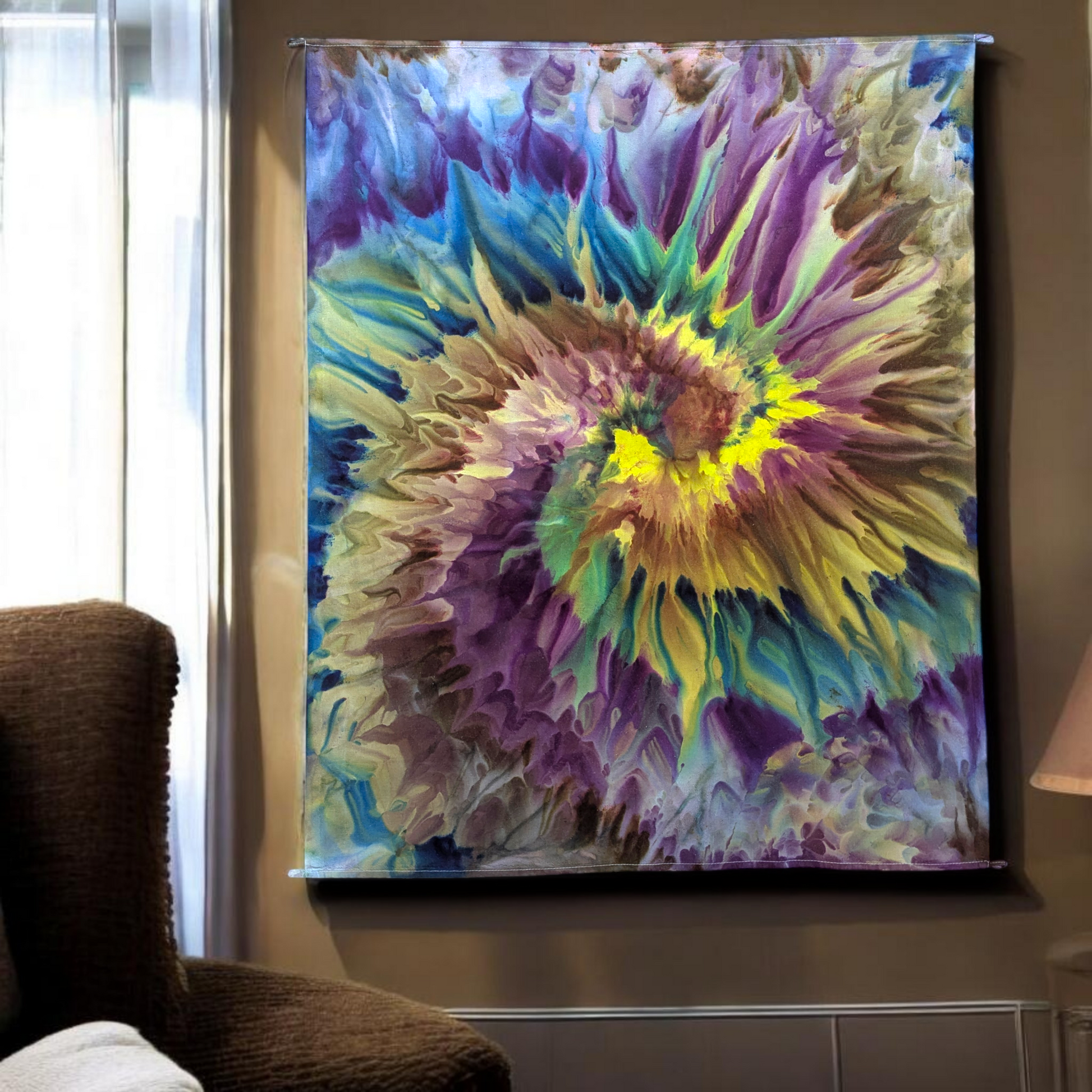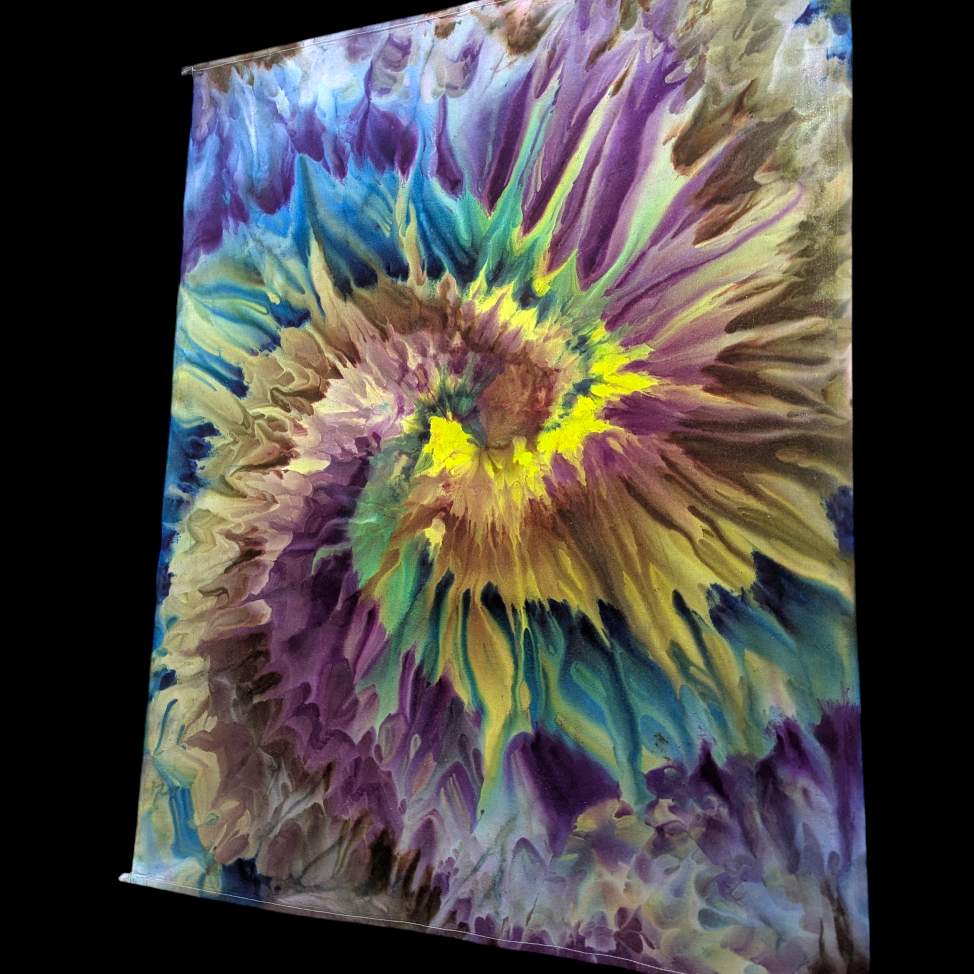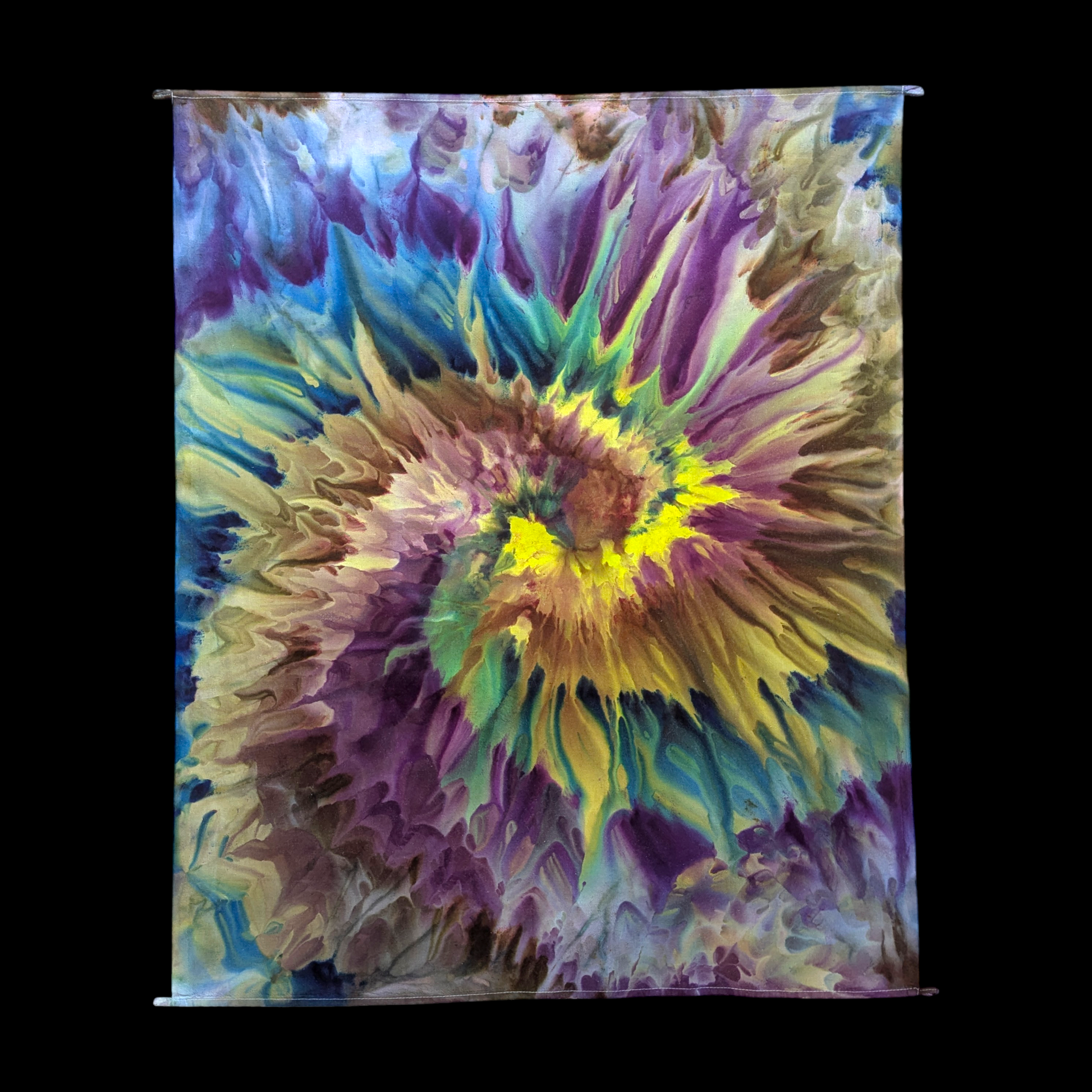 Ice Dyed by hand in the USA, this stunning piece will leave you breathless. You've never seen anything like it! Slightly larger than a poster at 42"x38", the brilliant earthy depths will leave you searching for a foothold on reality. A true piece of American art that would feel at home on the wall of your home, or the Museum of Modern Art.