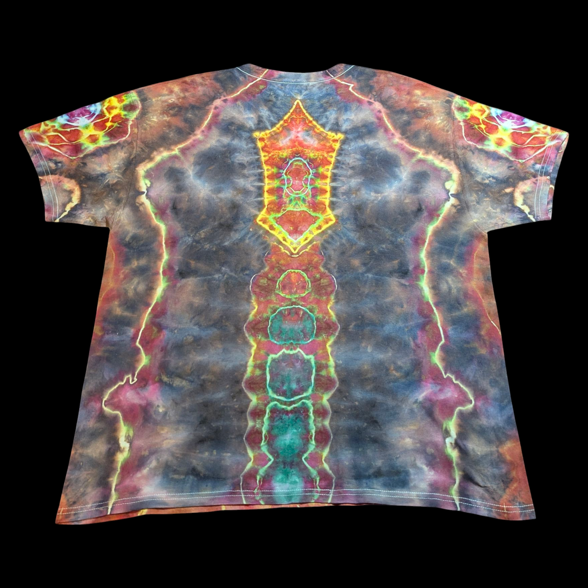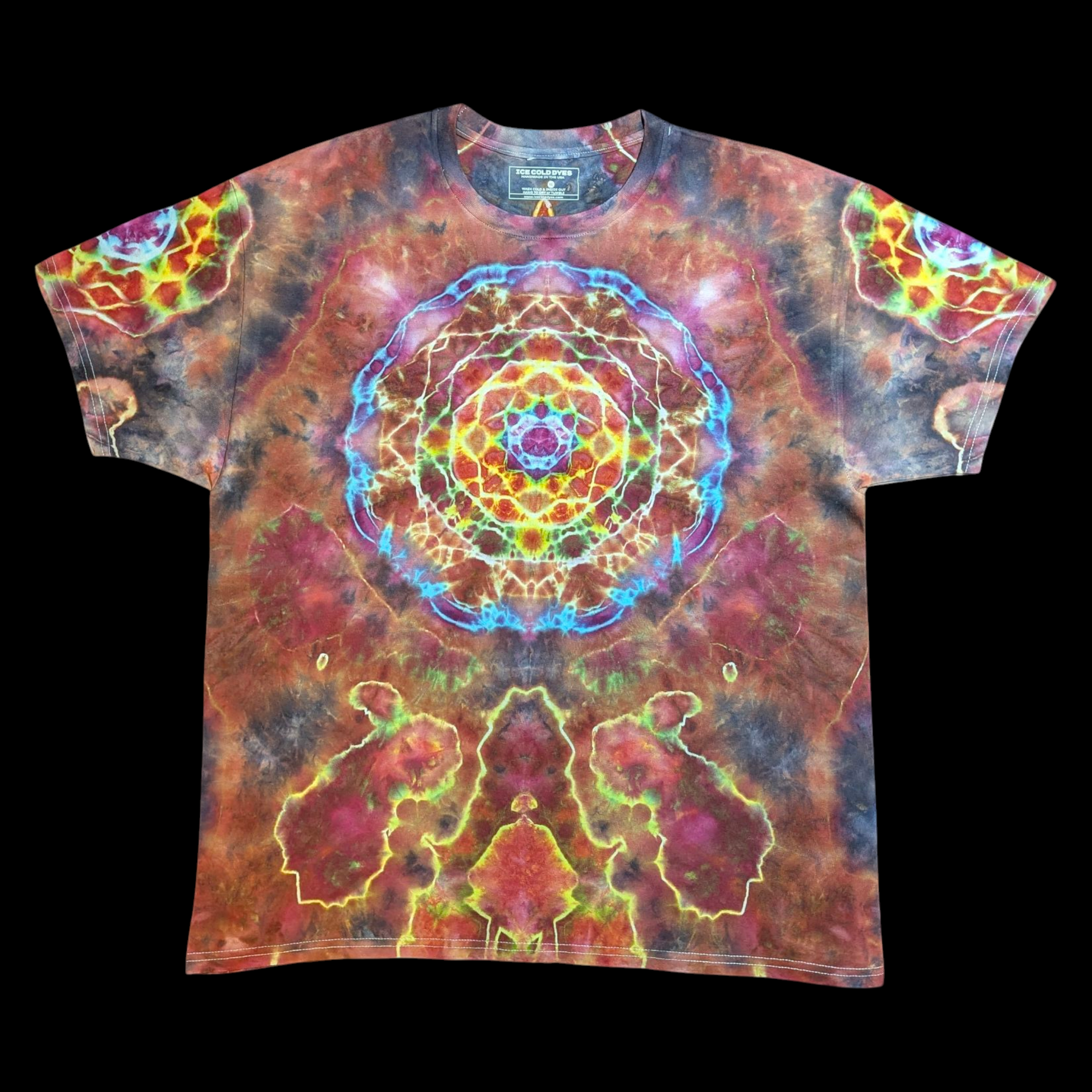 Soft streams of earthy brown and meadow green drift like shadows darting through a field. Gentle arcs form unexpected patterns as the ice dissolved, shaping a design that feels playful and organic. Dyed by hand, this XL shirt is a singular piece of cotton artistry, rooted in nature’s rhythm.