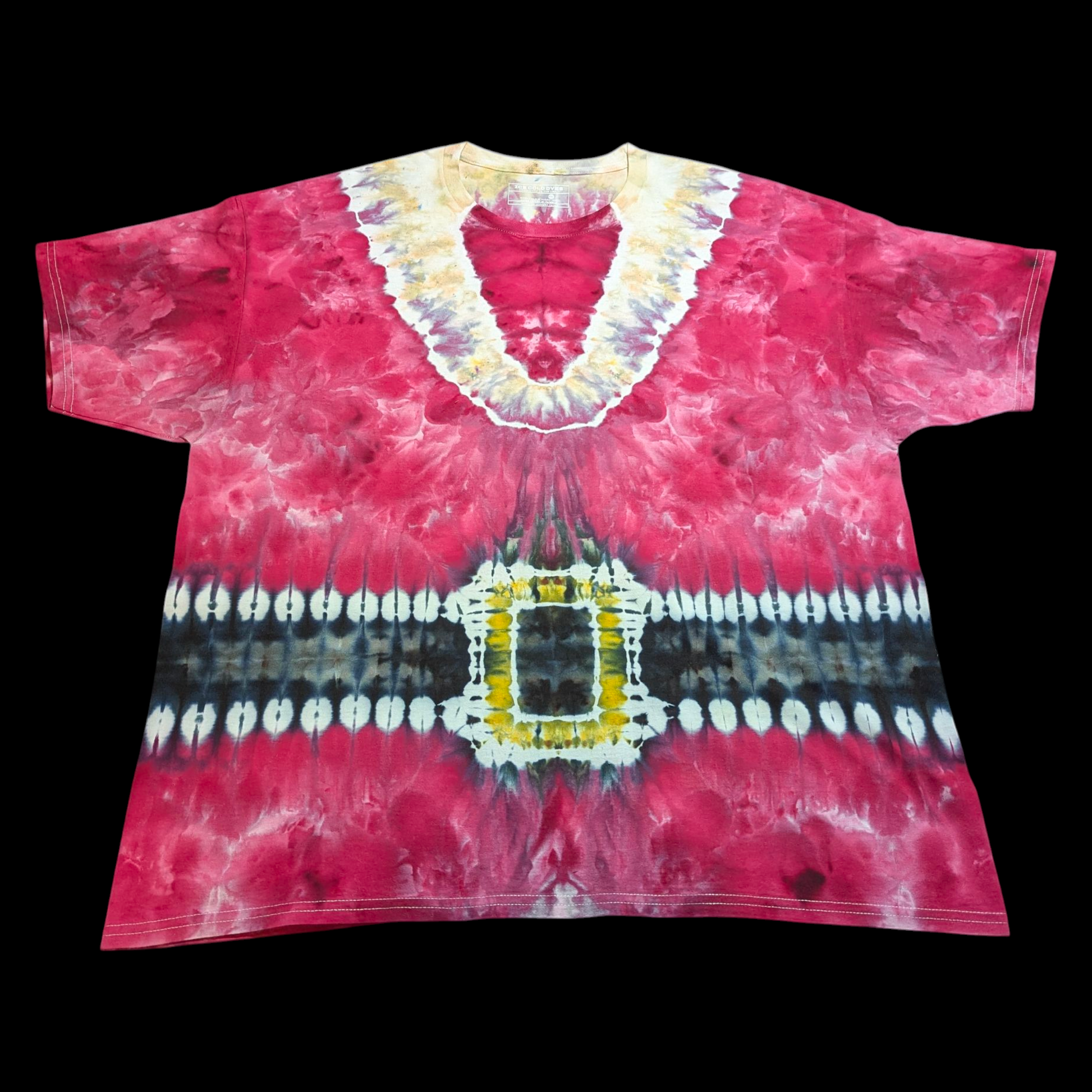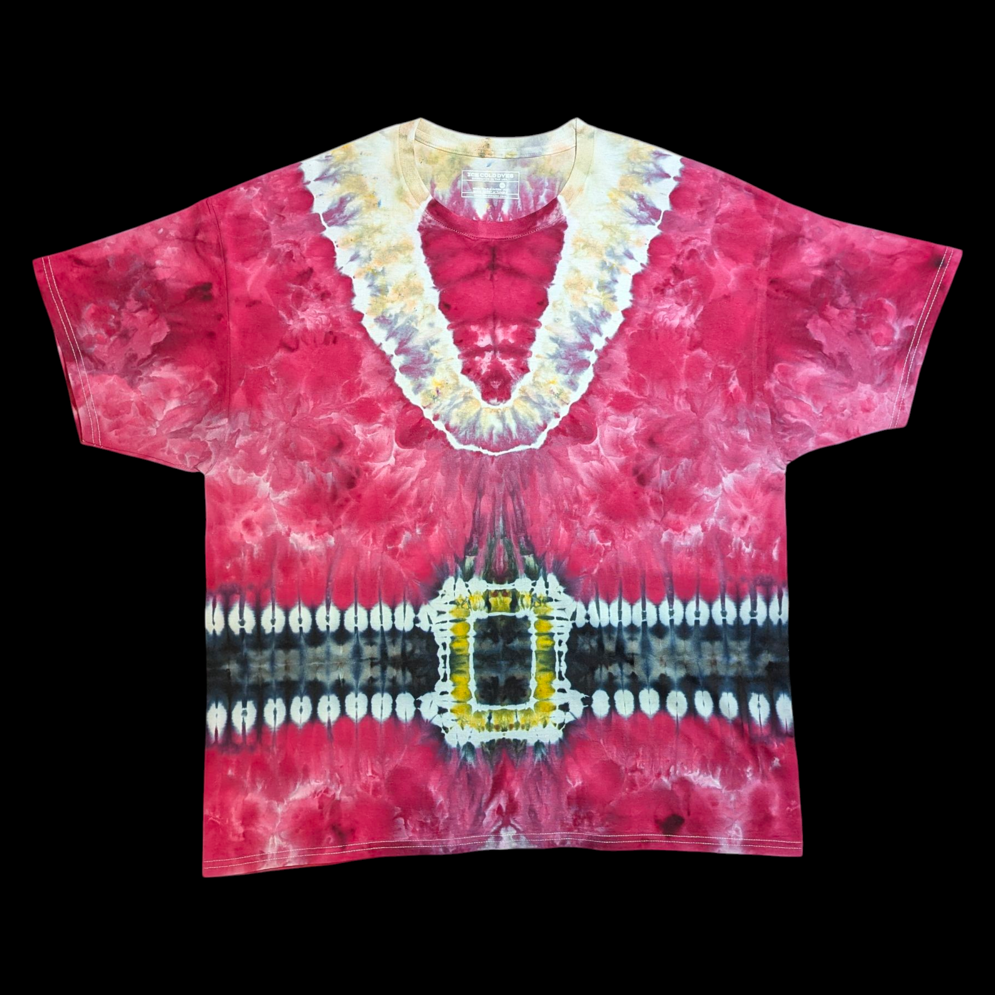 Saint of Circumstance captures the unmistakable spirit of old-world Santa — rich crimson tones dominate the fabric, wrapped with a deep black “belt” and a glowing golden “buckle” that anchors the design in festive nostalgia. Cream and white highlights form a soft collar effect, like frost resting on velvet. Crafted from durable 6.1oz cotton, this ice-dyed piece transforms classic holiday imagery into bold, modern art.