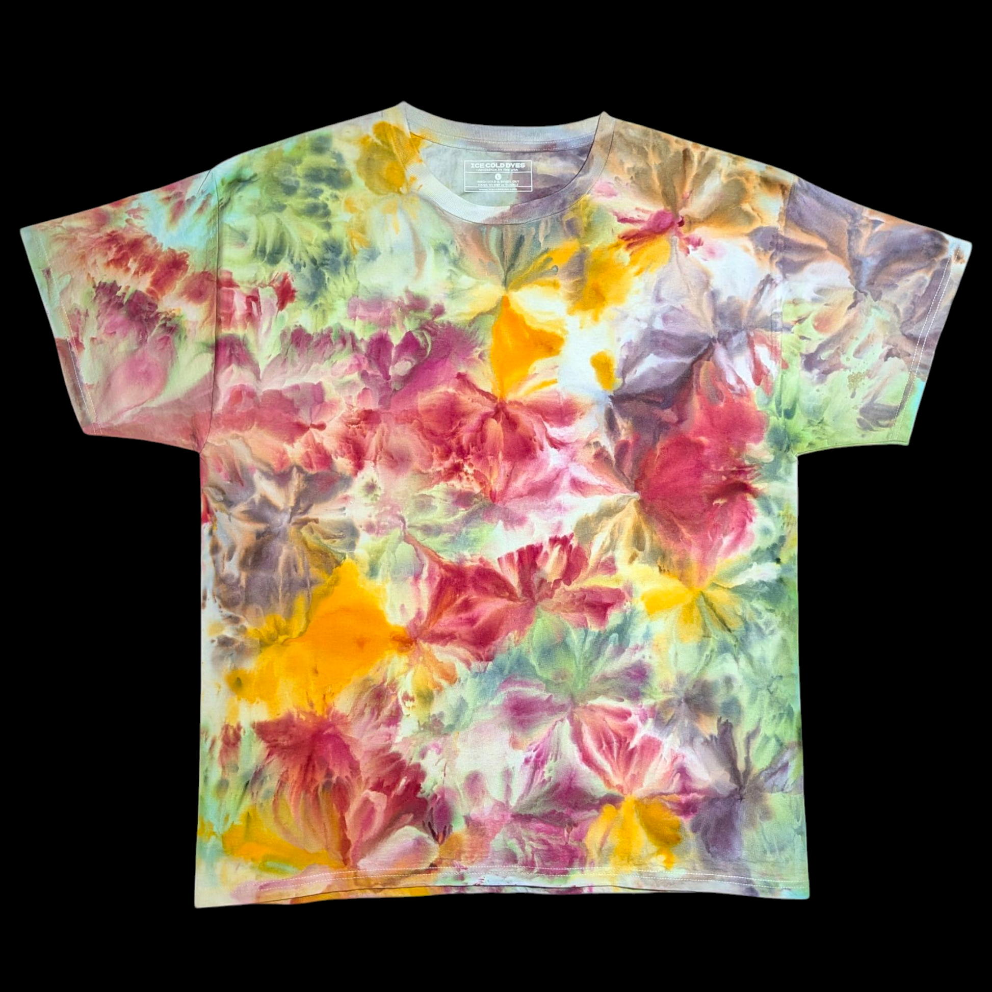 Bloom bright in this hand-dyed floral-inspired tee. Bursting with color, the shirt features a kaleidoscope of golden yellows, rose reds, soft purples, and leafy greens, creating a lush garden effect across the fabric. The marbled dye technique gives the impression of watercolor petals blending together, making every piece feel like a walking canvas.